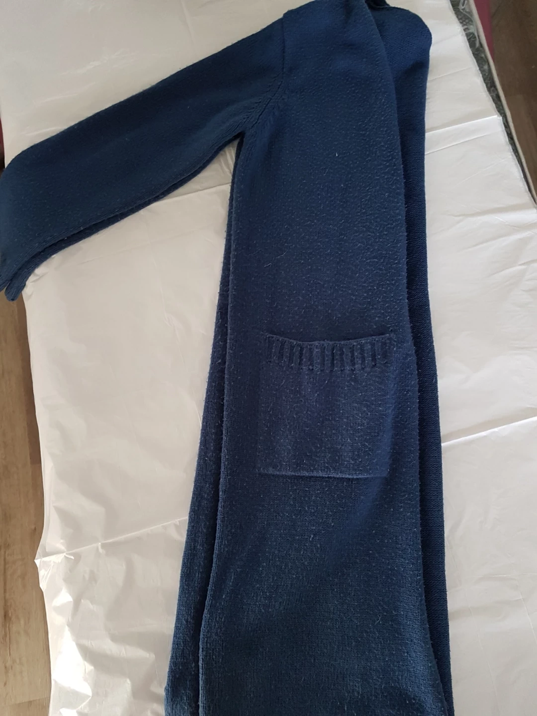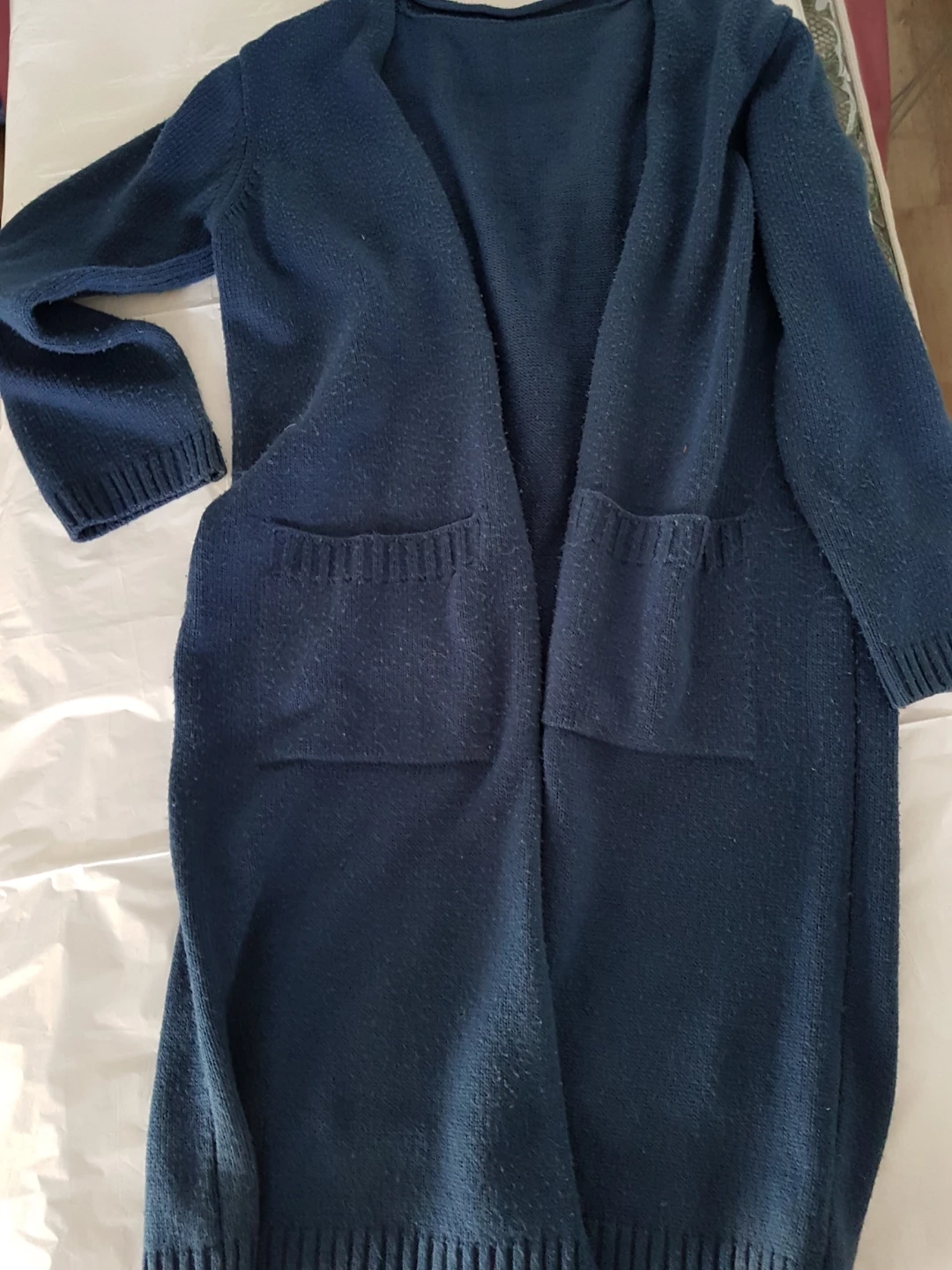 A cozy navy blue longline cardigan. It's made of a soft knit material and features two front pockets. Great for layering during cooler weather! Size O/S