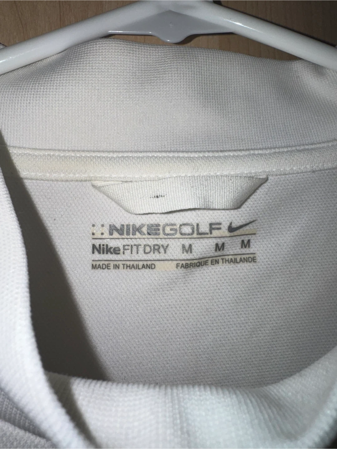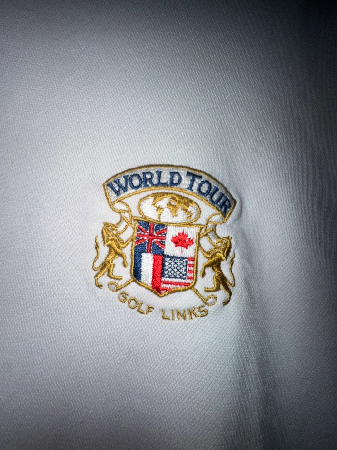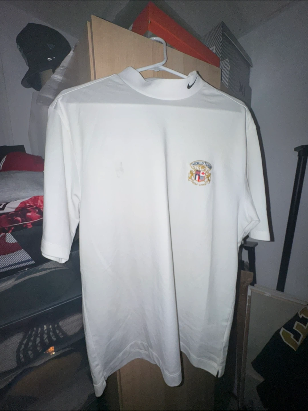 This is a white Nike Golf polo mock neck shirt with a "World Tour Golf Links" crest. It's a size men’s medium and made with Nike's Fit Dry material. This shirt is great for golfing or casual wear.