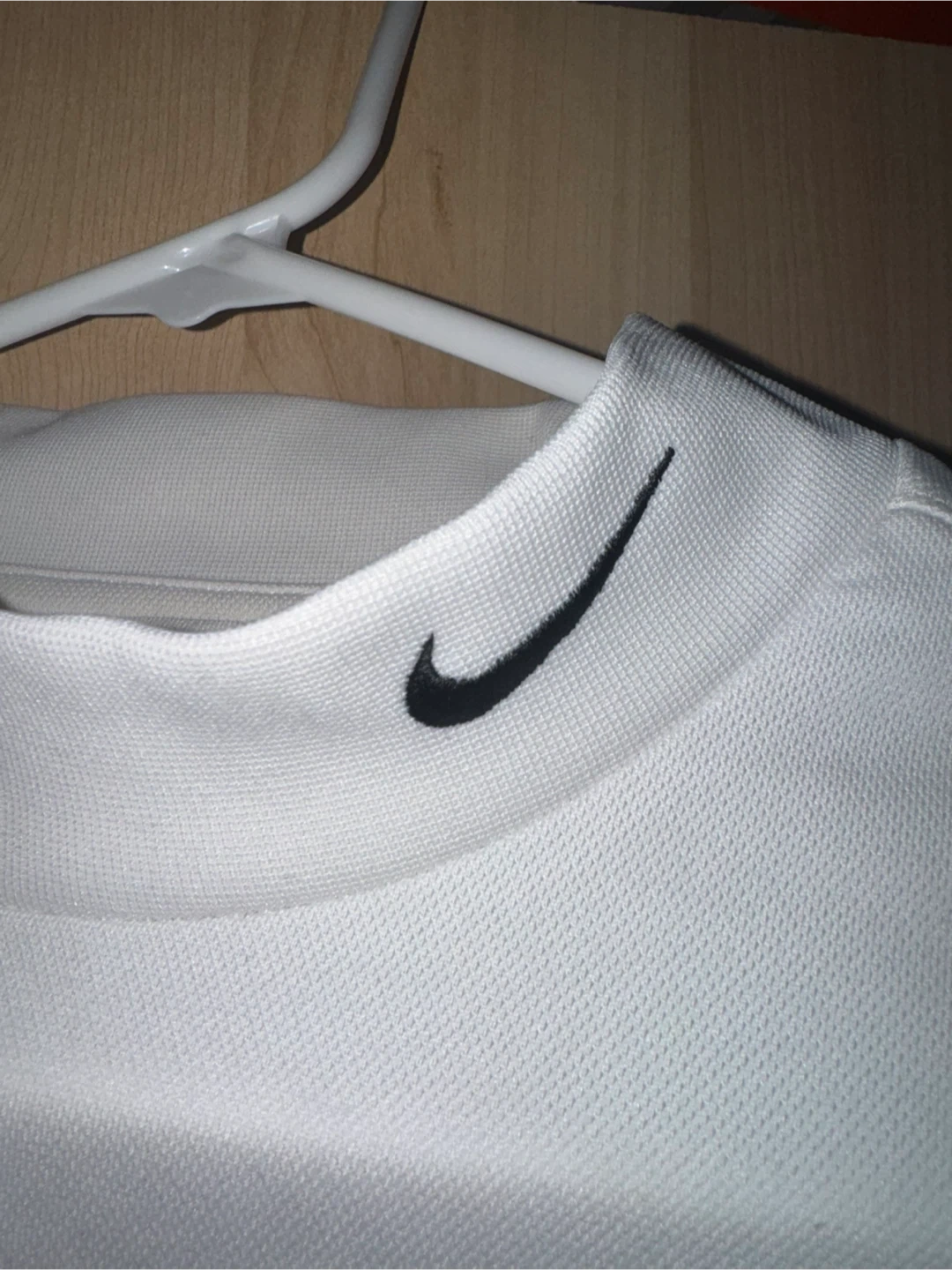 This is a white Nike Golf polo mock neck shirt with a "World Tour Golf Links" crest. It's a size men’s medium and made with Nike's Fit Dry material. This shirt is great for golfing or casual wear.