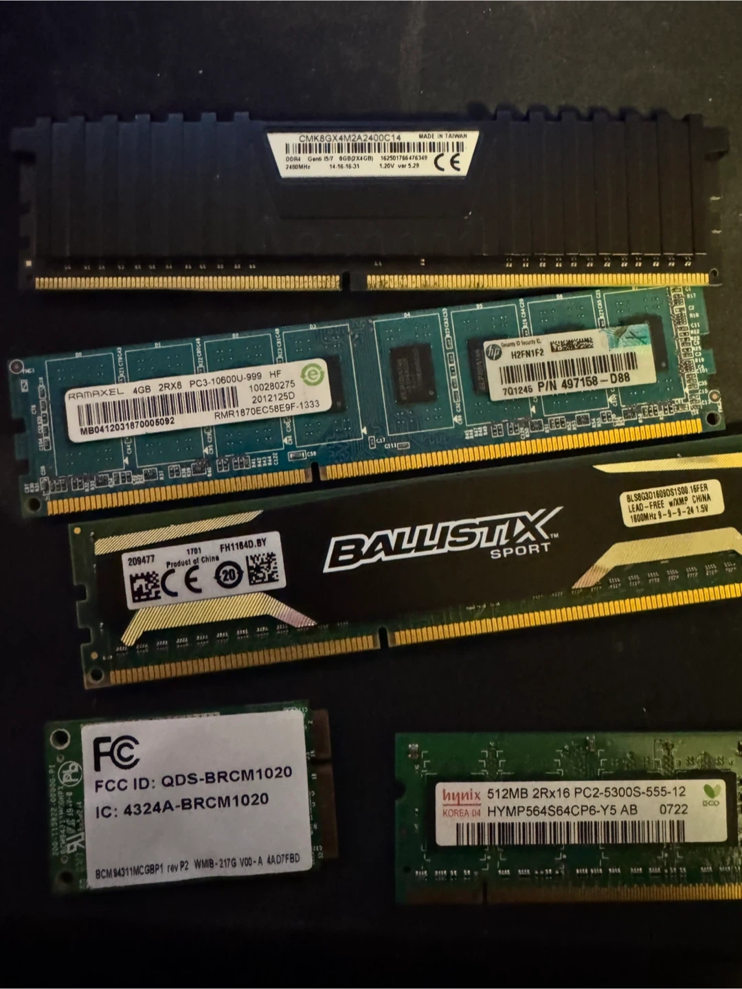 Bundle of various computer RAM modules including DDR4, DDR3, and DDR2. Includes brands like Ballistix Sport, Ramaxel, and Hynix. Specs vary by module.