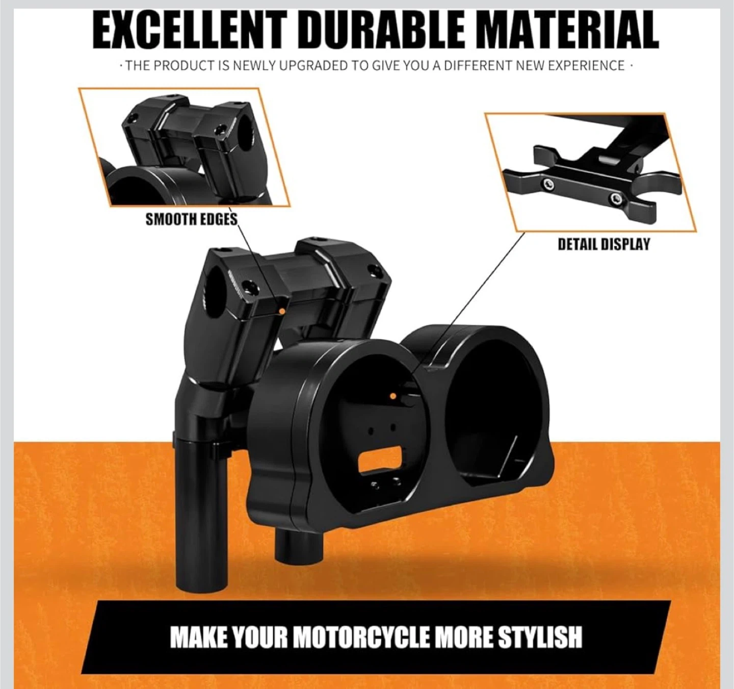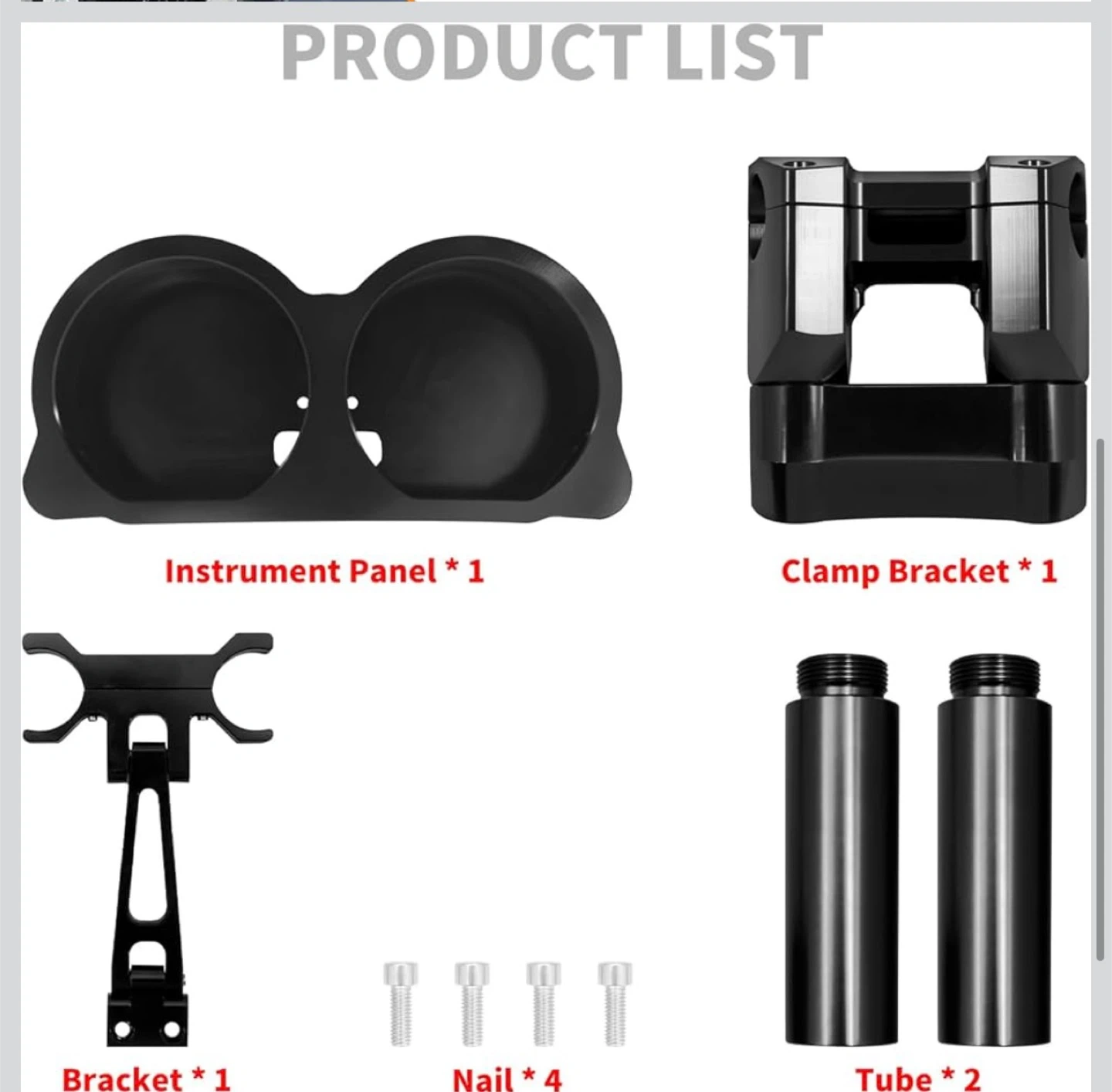 HCMOTORKU handlebar riser with instrument panel kit in black. Made from high-quality steel. Fits Harley Road Glide models 2015-up. Includes instrument panel, clamp bracket, bracket, 4 nails, and 2 tubes.