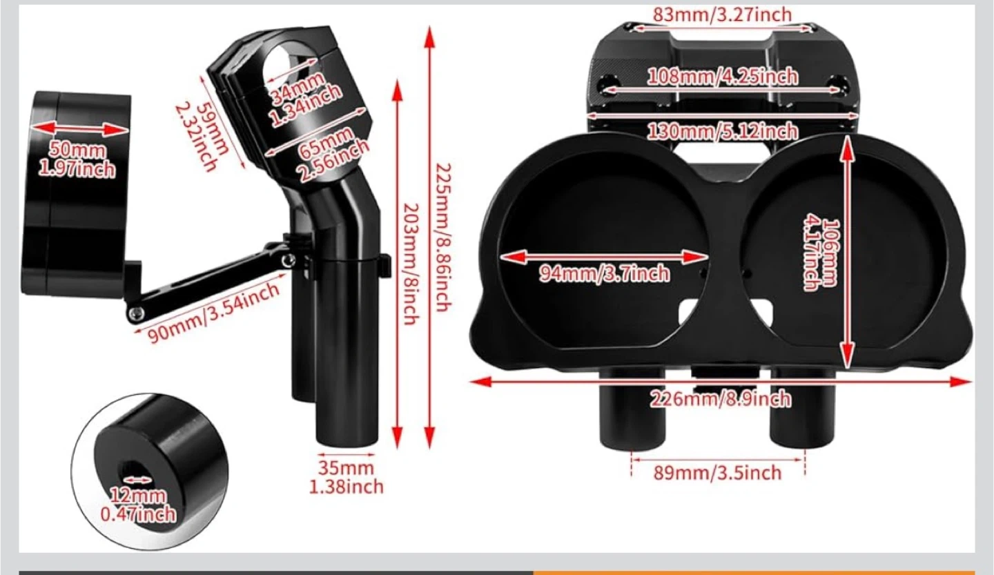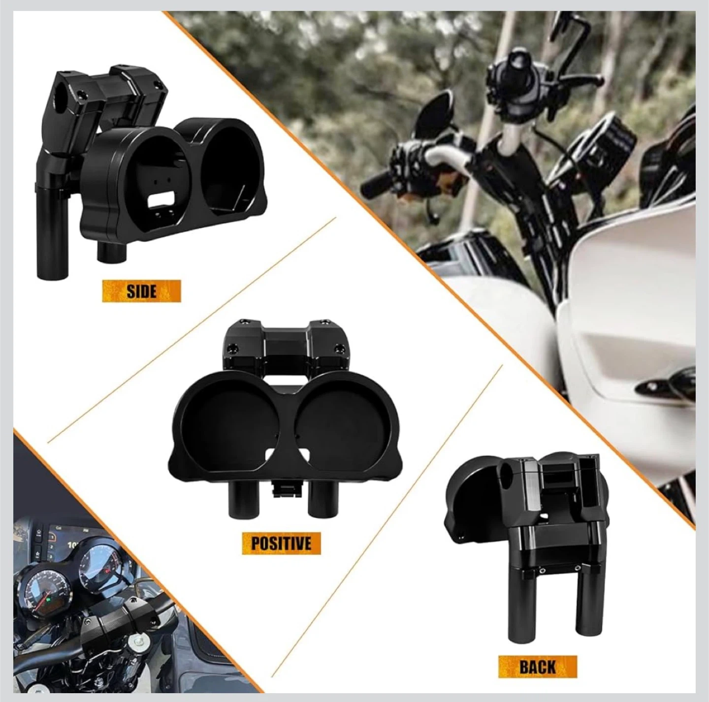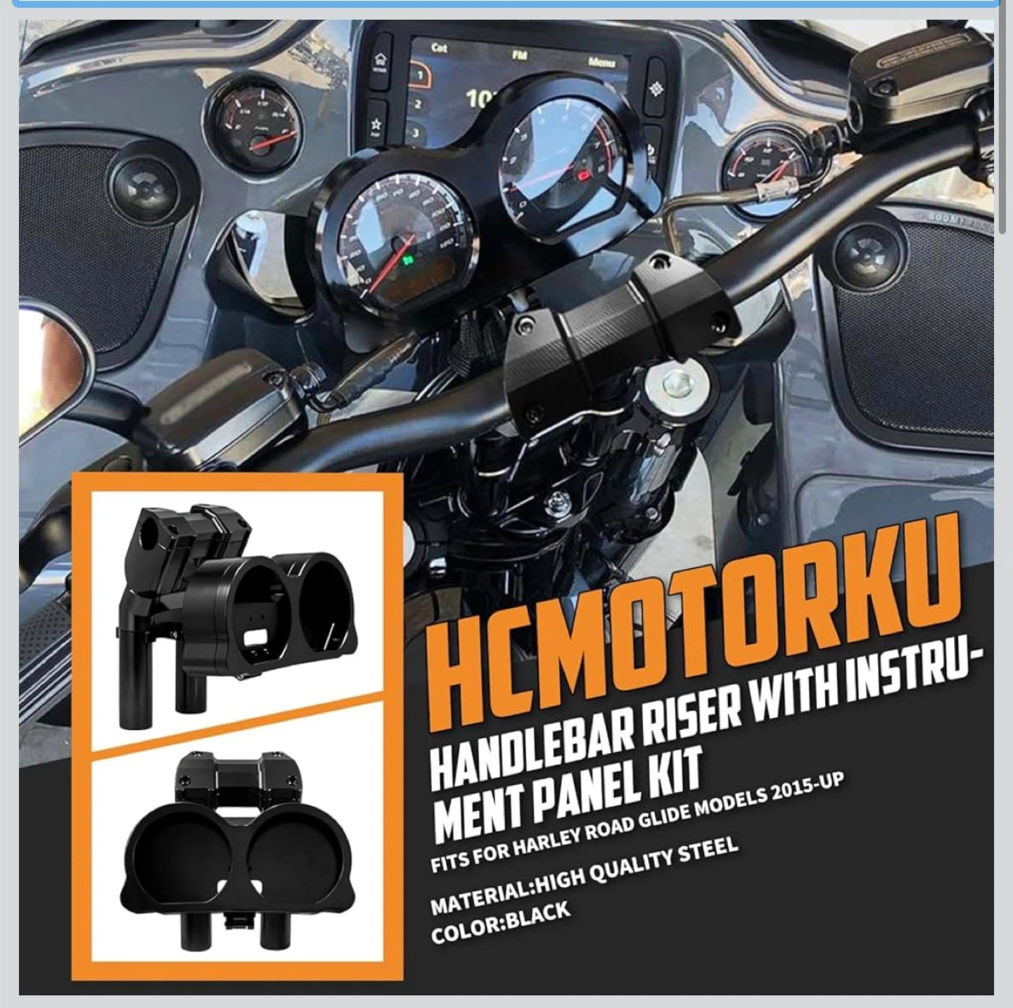 HCMOTORKU handlebar riser with instrument panel kit in black. Made from high-quality steel. Fits Harley Road Glide models 2015-up. Includes instrument panel, clamp bracket, bracket, 4 nails, and 2 tubes.