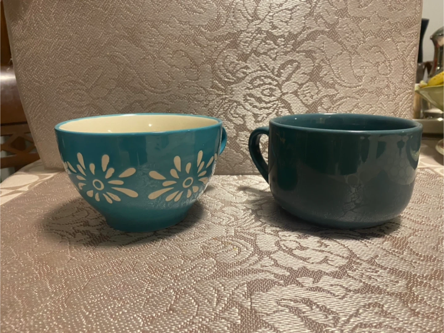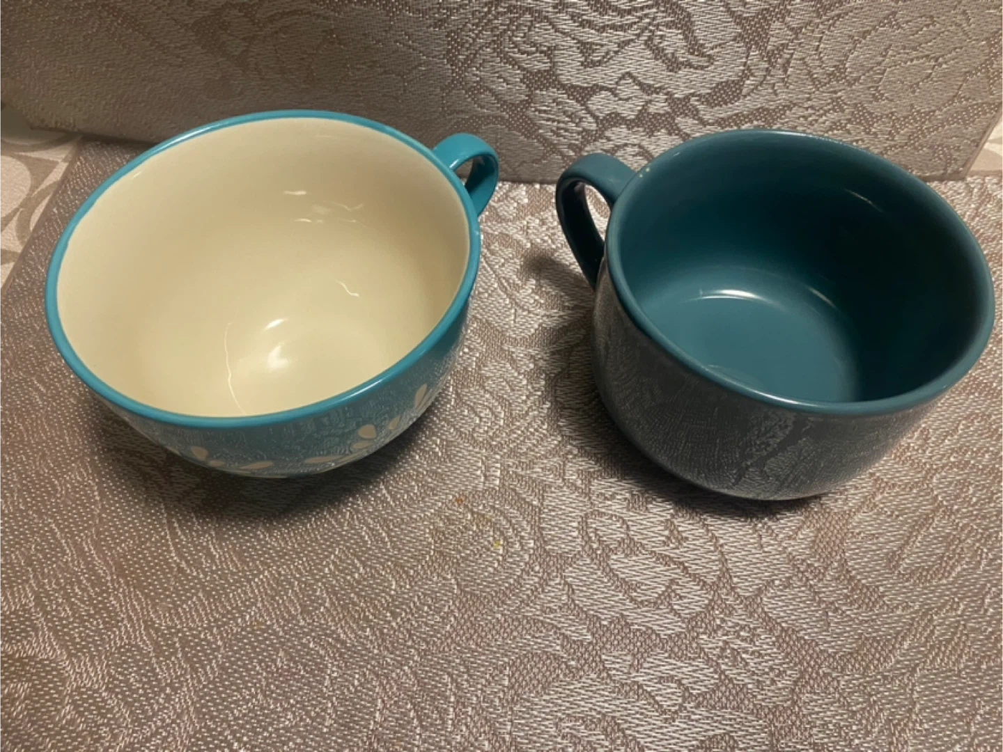 Two ceramic soup bowls are included in this set. One bowl is teal with a white floral design, and the other is a solid dark teal. They're perfect for enjoying a warm bowl of soup!