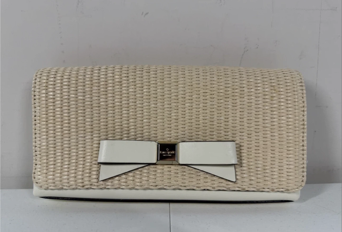 Kate Spade Montford Park Straw Keira Bow Clutch. Cream colored. It features a white leather bow detail on the front. This bag is perfect for summer occasions!