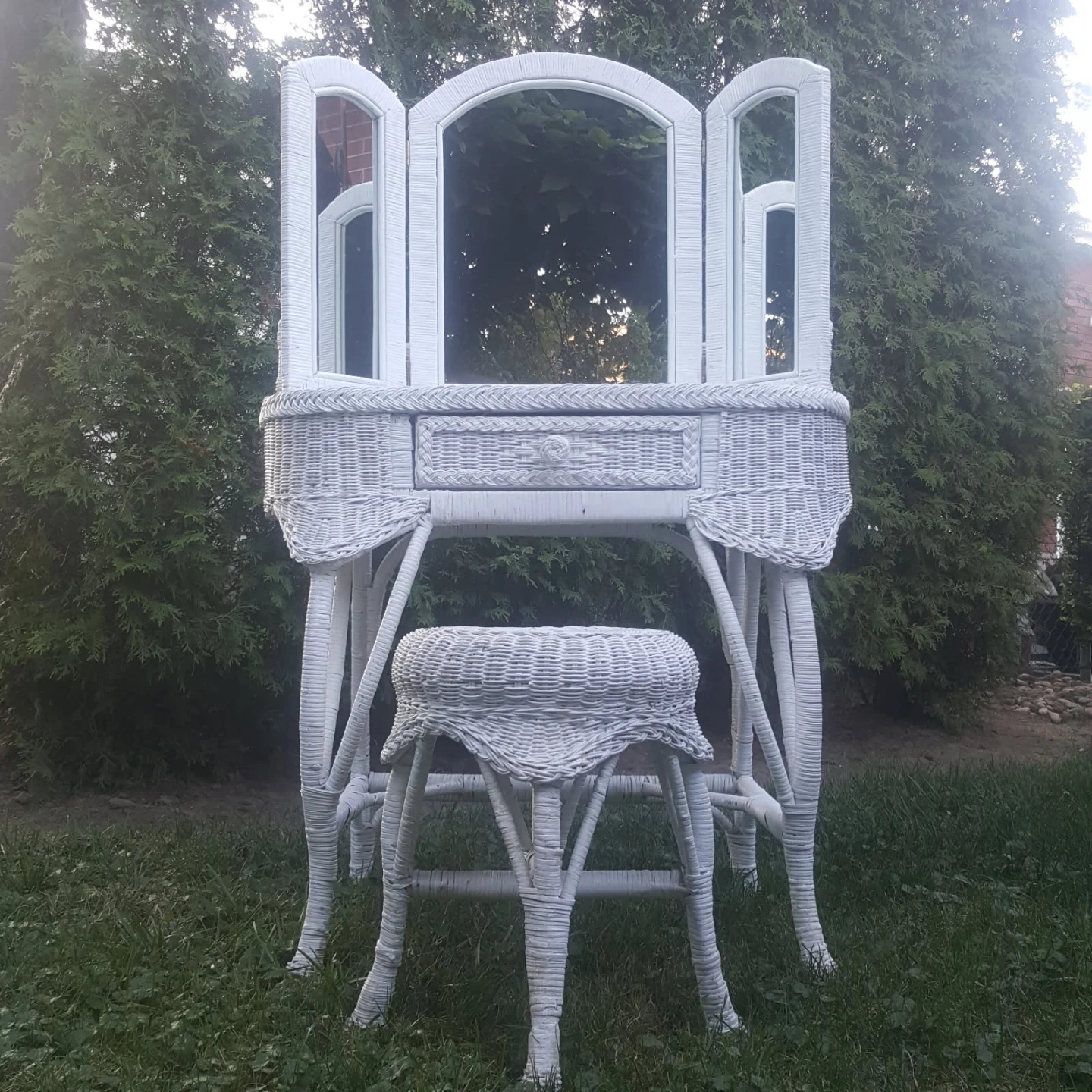 This charming white wicker vanity is a stylish addition to any bedroom or dressing area. The set includes a vanity table with a glass top, a mirrored triptych, and a matching stool. The vanity features a drawer for storage and an elegant design.