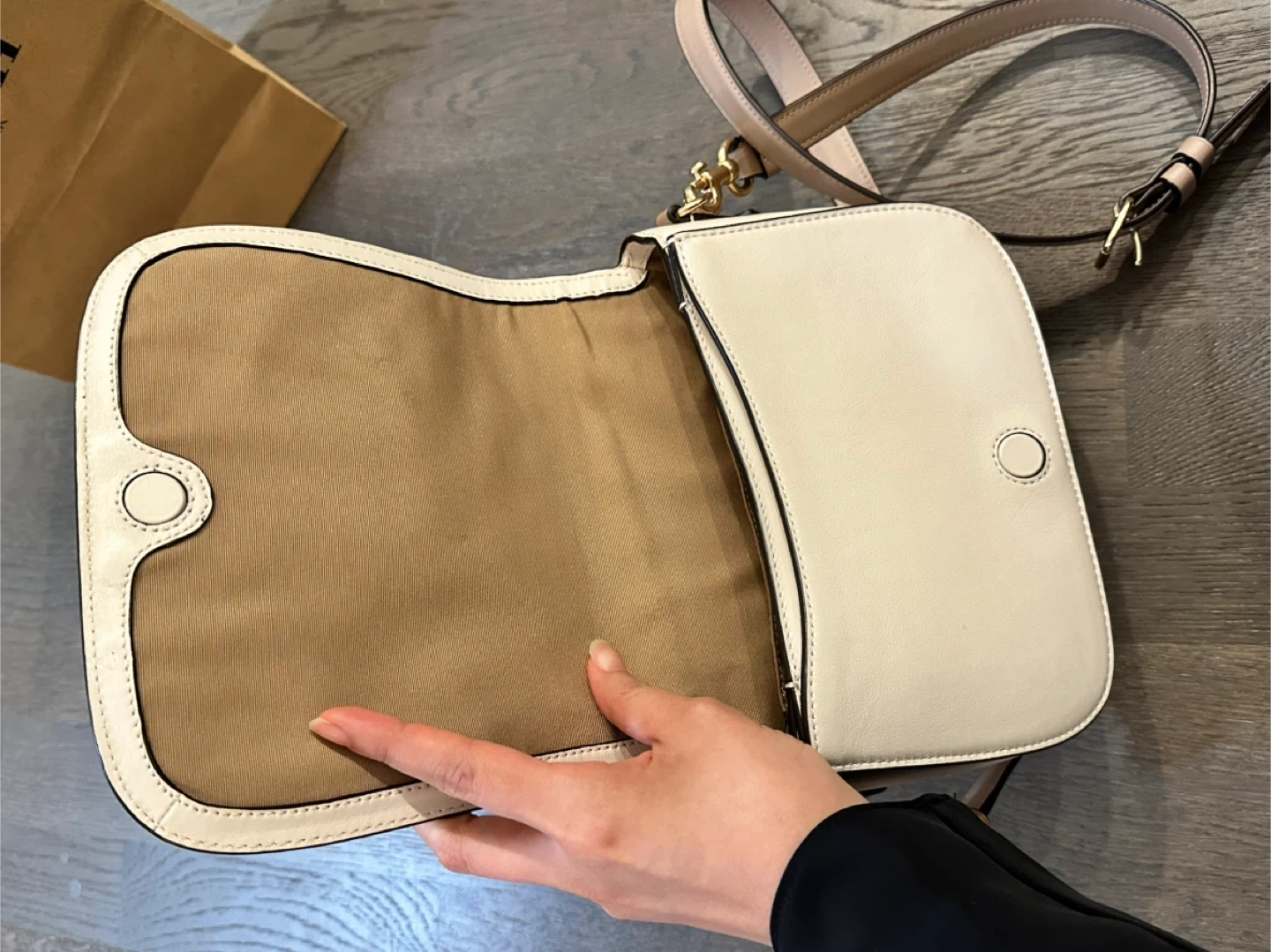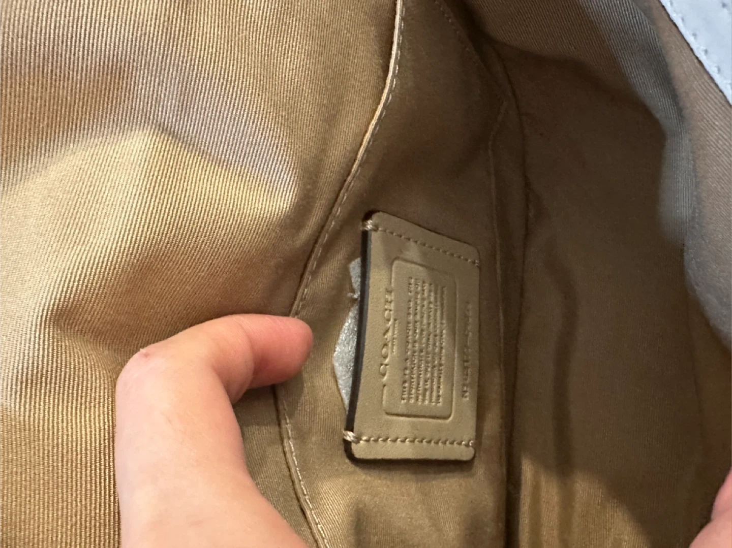 This is a Coach shoulder bag with the signature carriage pattern. It's made with leather and has a light beige color. Includes adjustable strap and Coach bag.