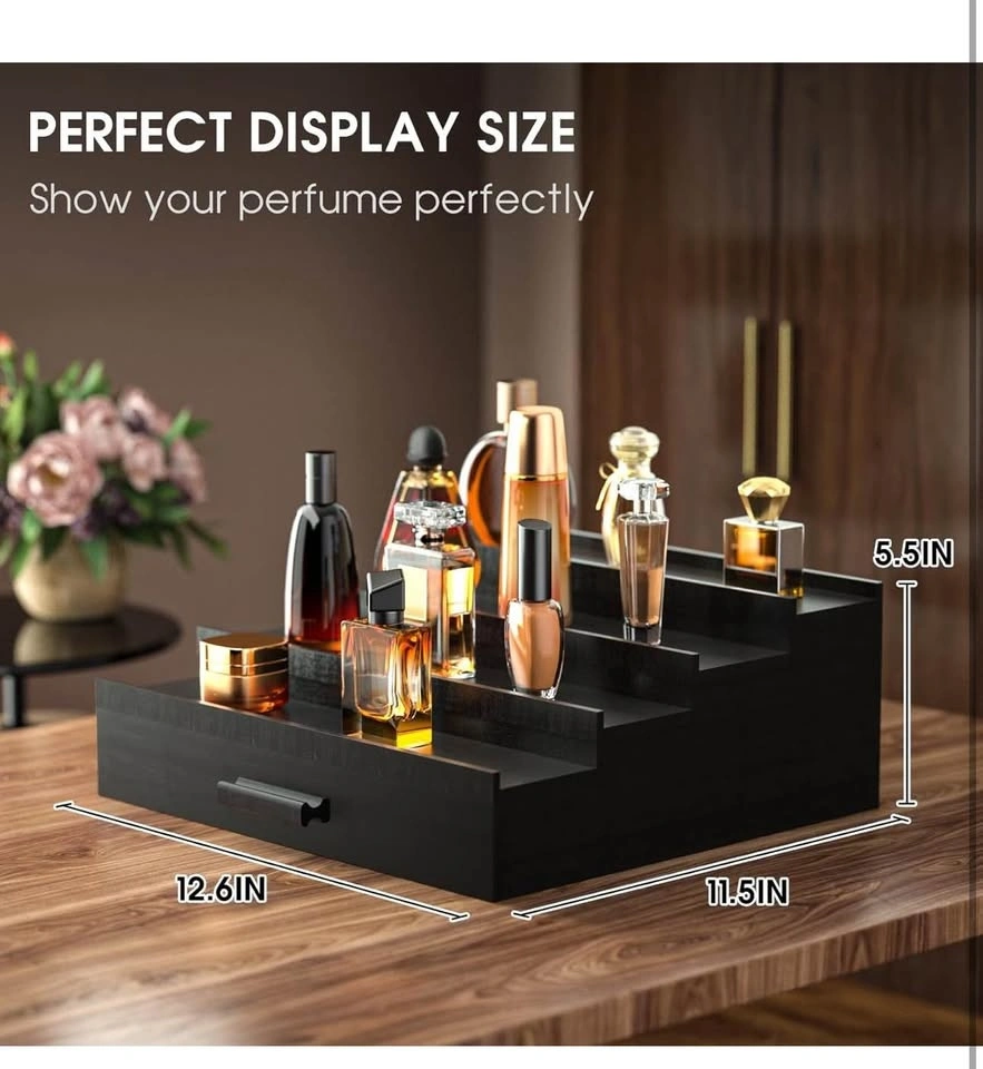 Sleek black tiered display organizer for your perfumes and makeup. Has a handy pull-out drawer with compartments for jewelry, watches, or other small items, plus a hidden storage spot. Measures about 12.6" L x 11.5" D x 5.5" H. Great for keeping your vanity tidy!
