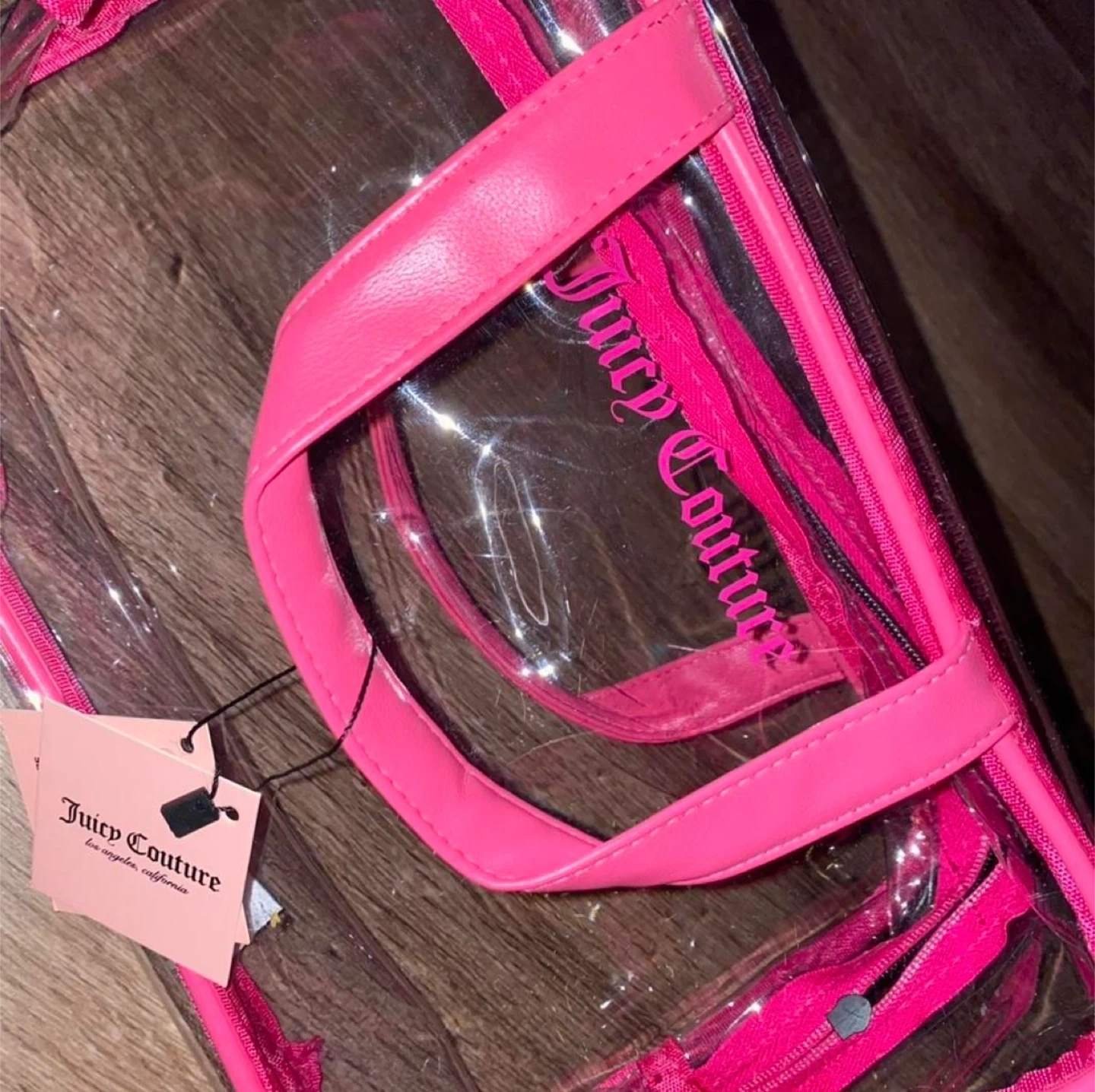 This is a clear Juicy Couture cosmetic bag with pink trim and handles. It has a zippered closure. The bag is perfect for organizing your makeup and toiletries.
