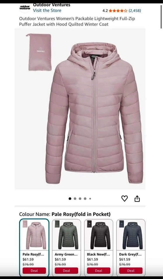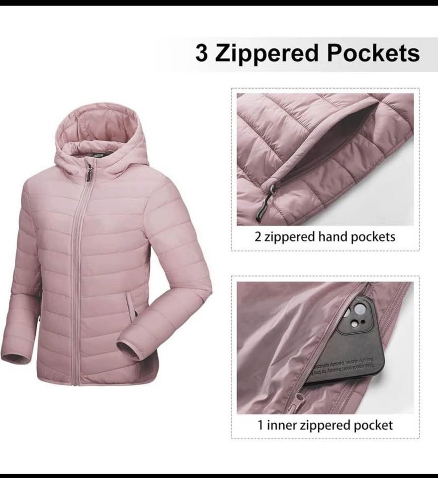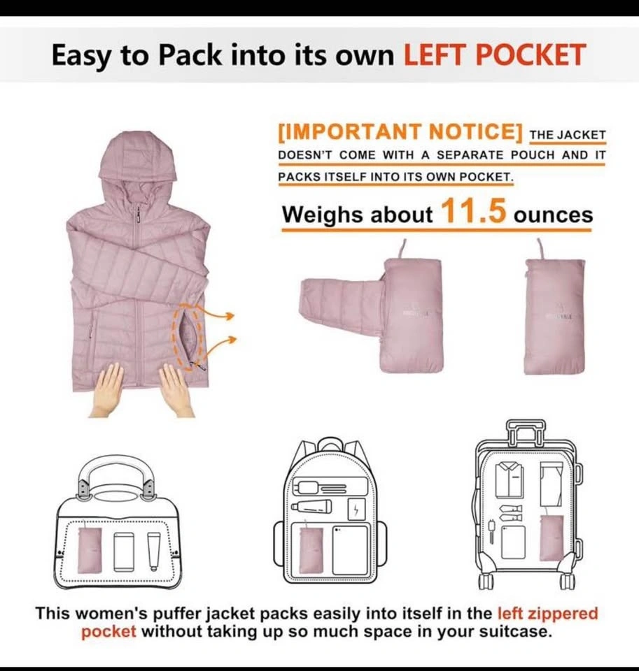 Packable Outdoor Ventures women's puffer jacket. This pale rosy pink coat has a full-zip front and a hood. Super lightweight, weighs about 11.5 ounces. Has 3 zippered pockets, two for your hands and one inside. It packs right into its own left pocket, super convenient for travel or just stashing away. Quilted design is cute and cozy.