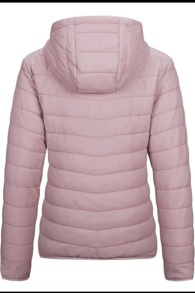 Packable Outdoor Ventures women's puffer jacket. This pale rosy pink coat has a full-zip front and a hood. Super lightweight, weighs about 11.5 ounces. Has 3 zippered pockets, two for your hands and one inside. It packs right into its own left pocket, super convenient for travel or just stashing away. Quilted design is cute and cozy.