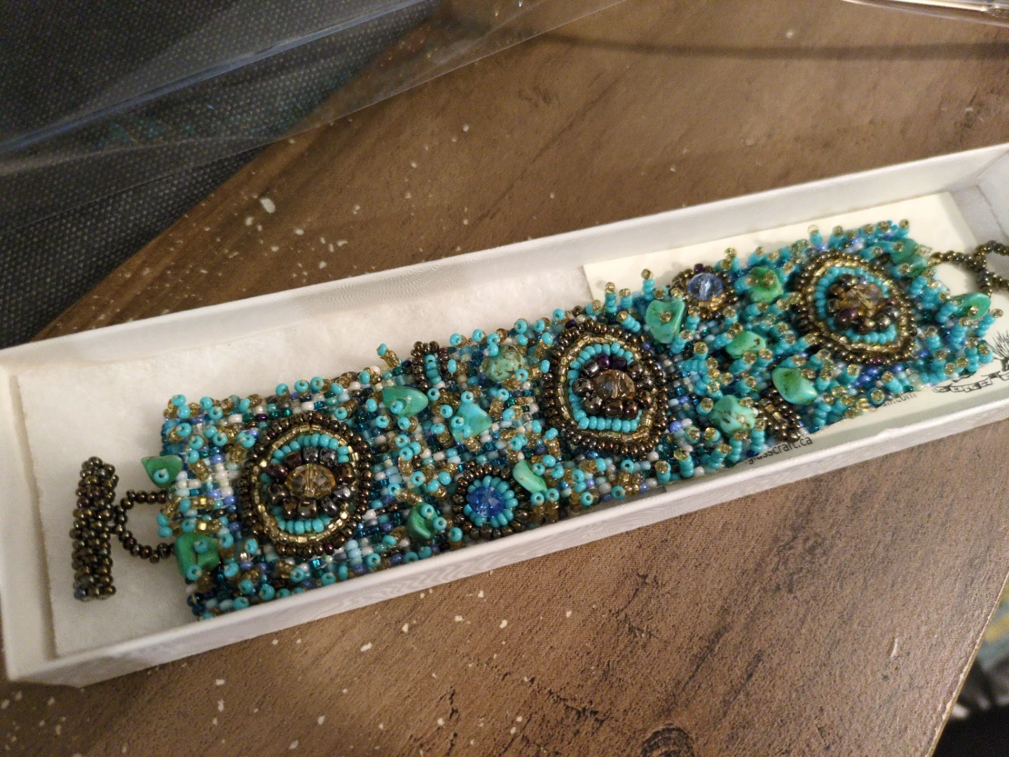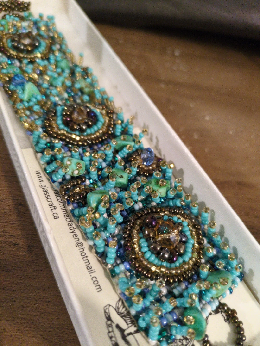 This beaded cuff bracelet features intricate beadwork in shades of turquoise, gold, and blue. It has a unique boho-chic design with a secure clasp. Add a statement piece to your jewellery collection!