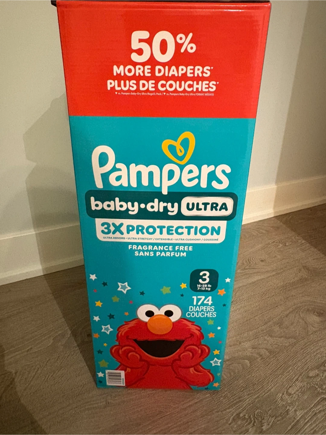 These Pampers Baby-Dry Ultra diapers offer 3X protection and are fragrance-free. They're designed for babies weighing 16-28 lbs. The box includes 174 diapers for a Sesame Street themed collection.