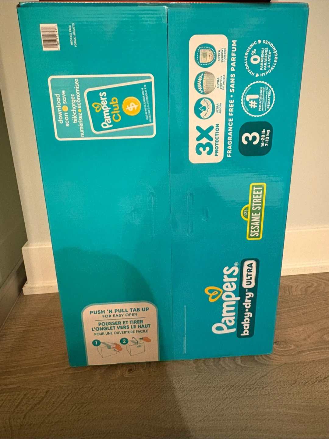 These Pampers Baby-Dry Ultra diapers offer 3X protection and are fragrance-free. They're designed for babies weighing 16-28 lbs. The box includes 174 diapers for a Sesame Street themed collection.
