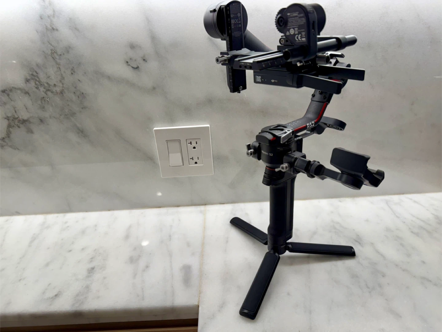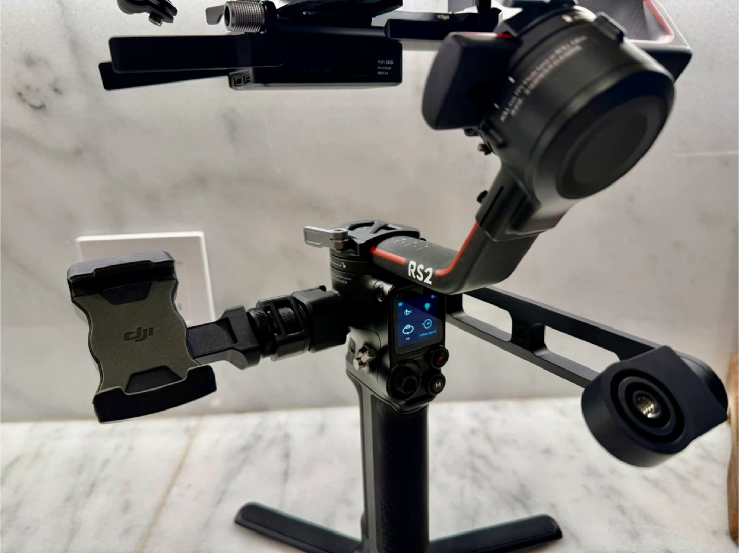 DJI RS2 gimbal stabilizer with all original accessories and carrying case included. It's designed for professional camera stabilization.