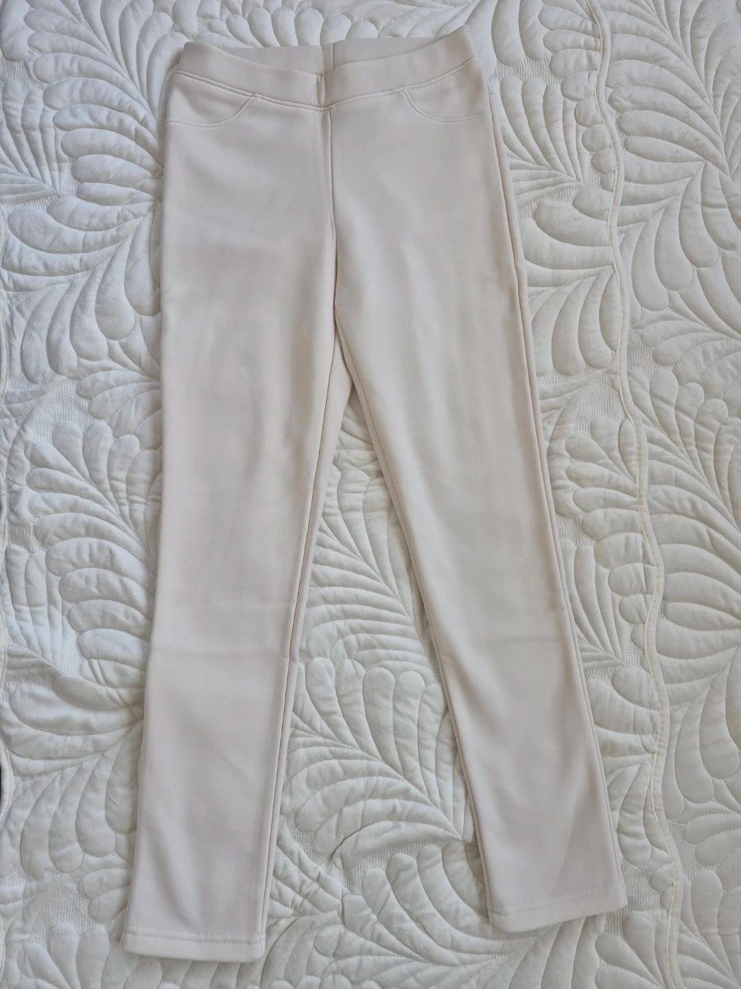 M.D. leggings in a cream colour. Size small. Made in Korea. These leggings are made with a soft, fleece-lined material, perfect for cooler weather.