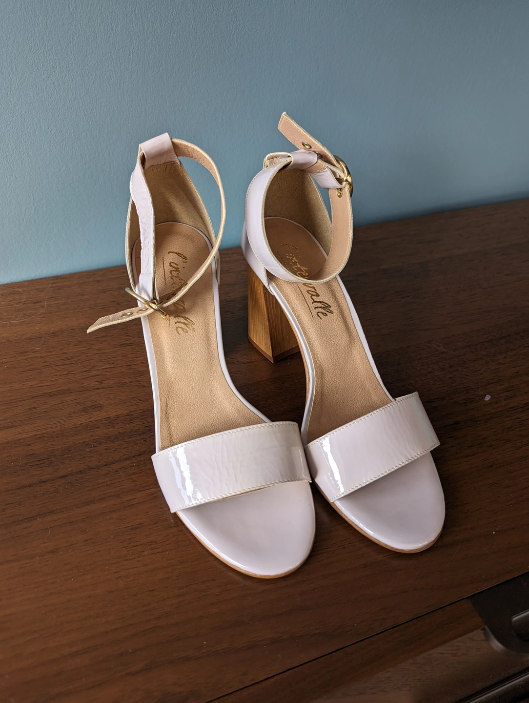 Sleek, architectural sandals featuring a chunky wood block heel and patent leather upper in a subtle nude with soft purple undertones. Clean lines and a pared-back silhouette make these versatile enough for work or weekend. Never worn