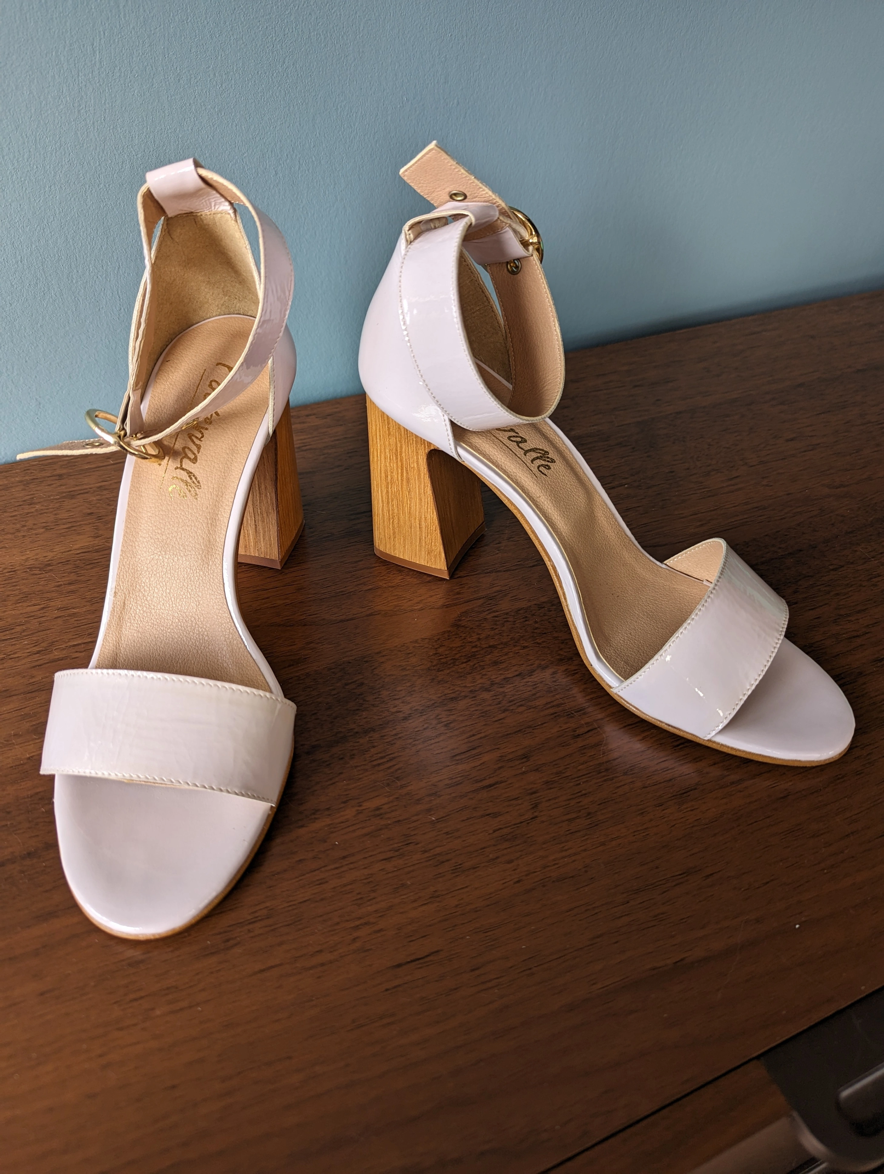 Sleek, architectural sandals featuring a chunky wood block heel and patent leather upper in a subtle nude with soft purple undertones. Clean lines and a pared-back silhouette make these versatile enough for work or weekend. Never worn