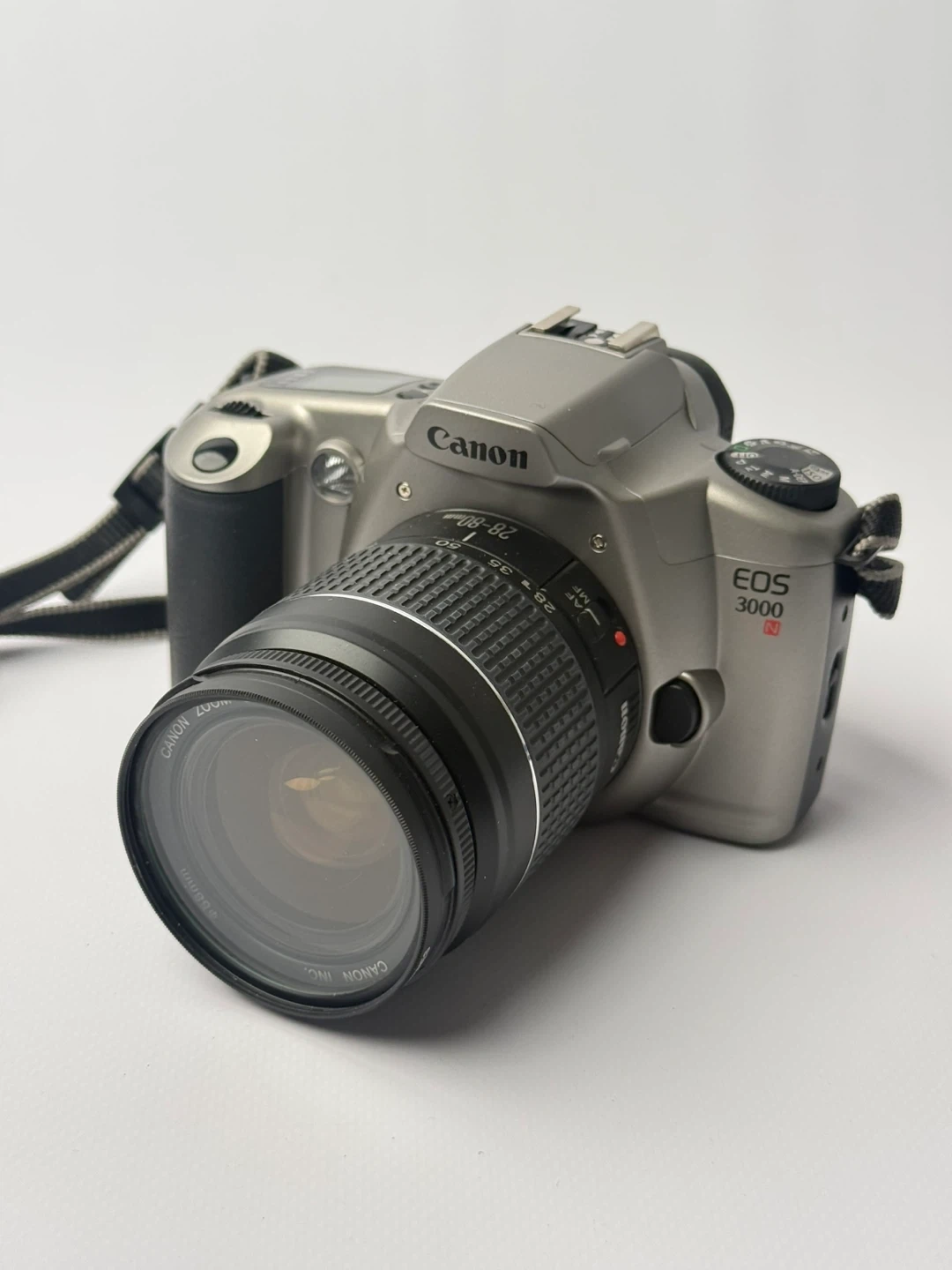 This is a Canon EOS 3000 35mm film camera with a Canon zoom lens. It's a great entry-level SLR for film photography enthusiasts. The camera has a silver and black finish. It's ready to capture your moments!