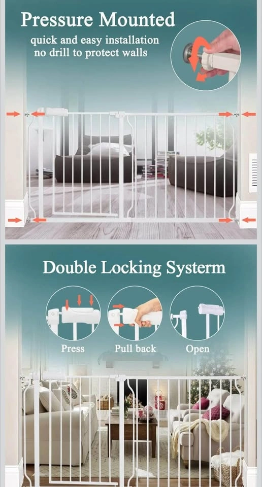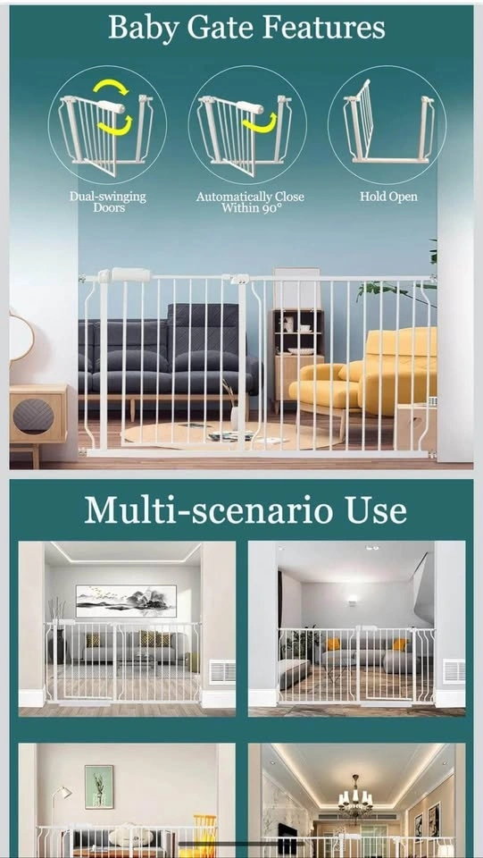 New, still in box. Pressure mounted baby gate, auto-close feature, opens from both sides. Includes a Hold Open feature. Made of durable steel, sturdy enough to bear 180 pounds. Double-lock safety release is difficult for toddlers to open but easy for adults to use with one hand. Fits openings from 52.76-57.48 inches. Can be extended for wider spaces (24.2 to 76.4 inches). Easy 5-minute installation without drilling. Feel free to message if you have any questions!