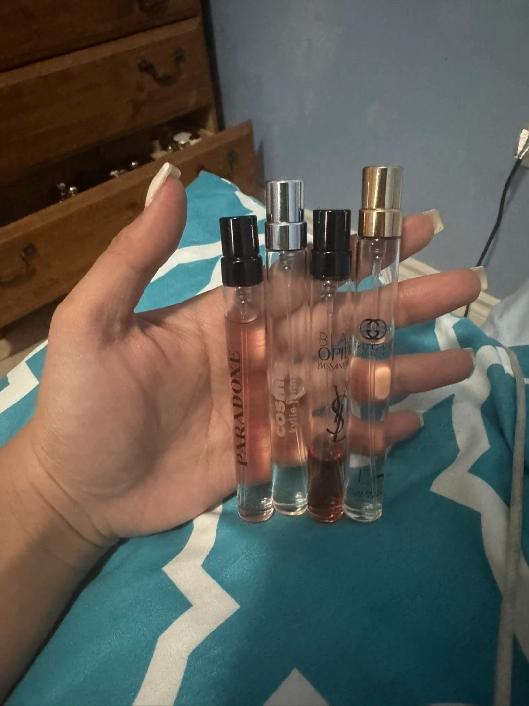 Four designer perfume sample vials. Includes Prada Paradoxe, Gucci Guilty, and Yves Saint Laurent Black Opium and cosmic by kylie. Perfect for trying out scents! Paradoxe is full 10 ml, gucci guilty about 7 ml , black opium is around 3-2 ml and cosmic is 5-4 ml left.