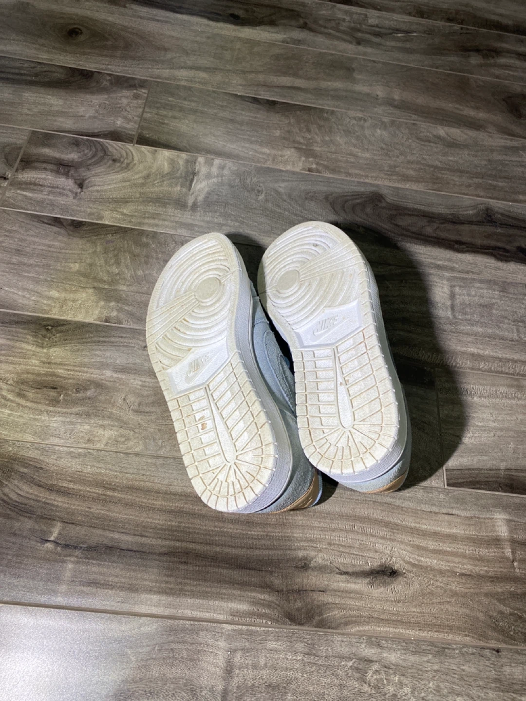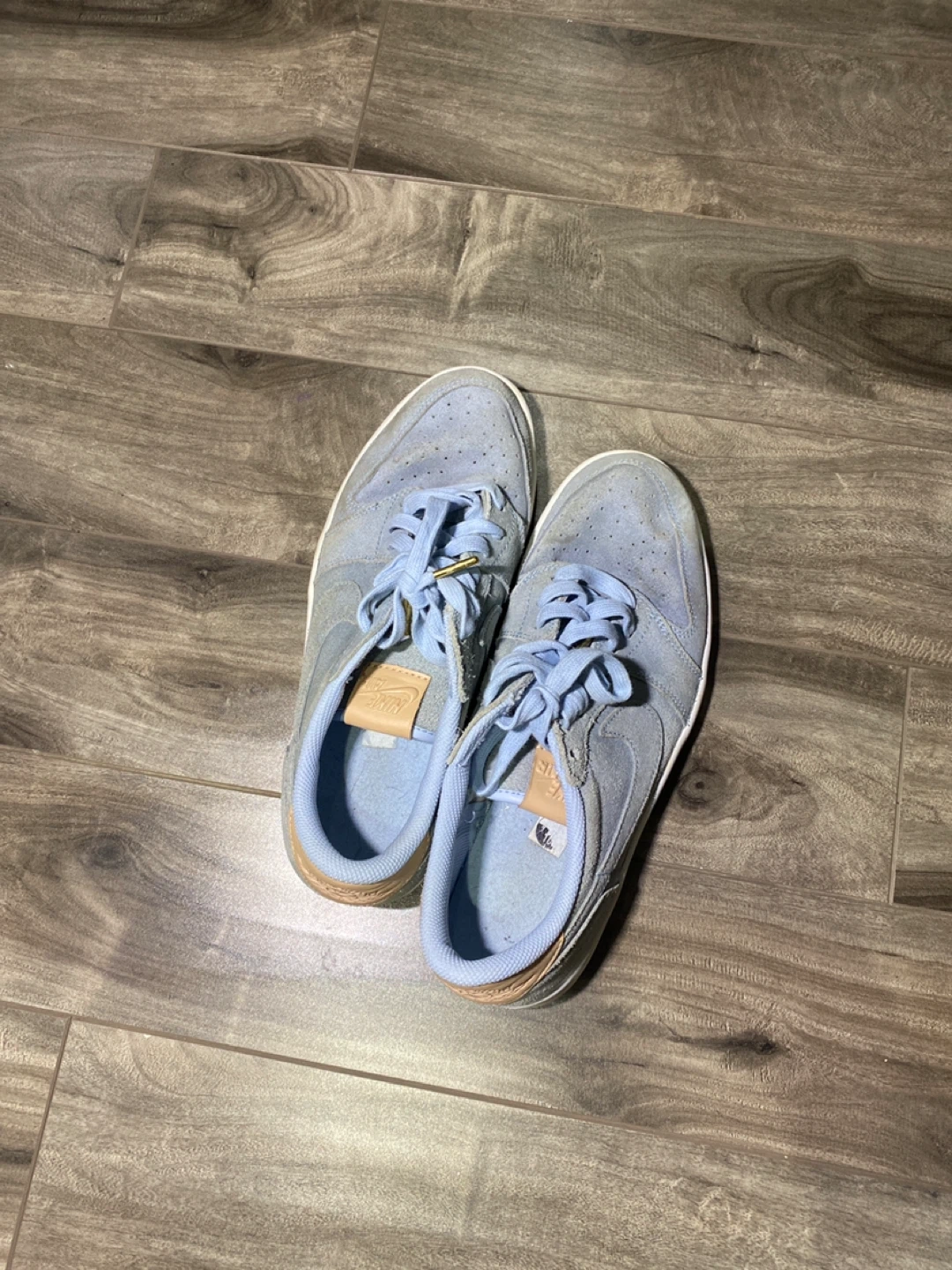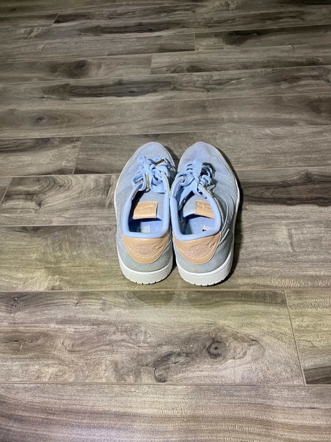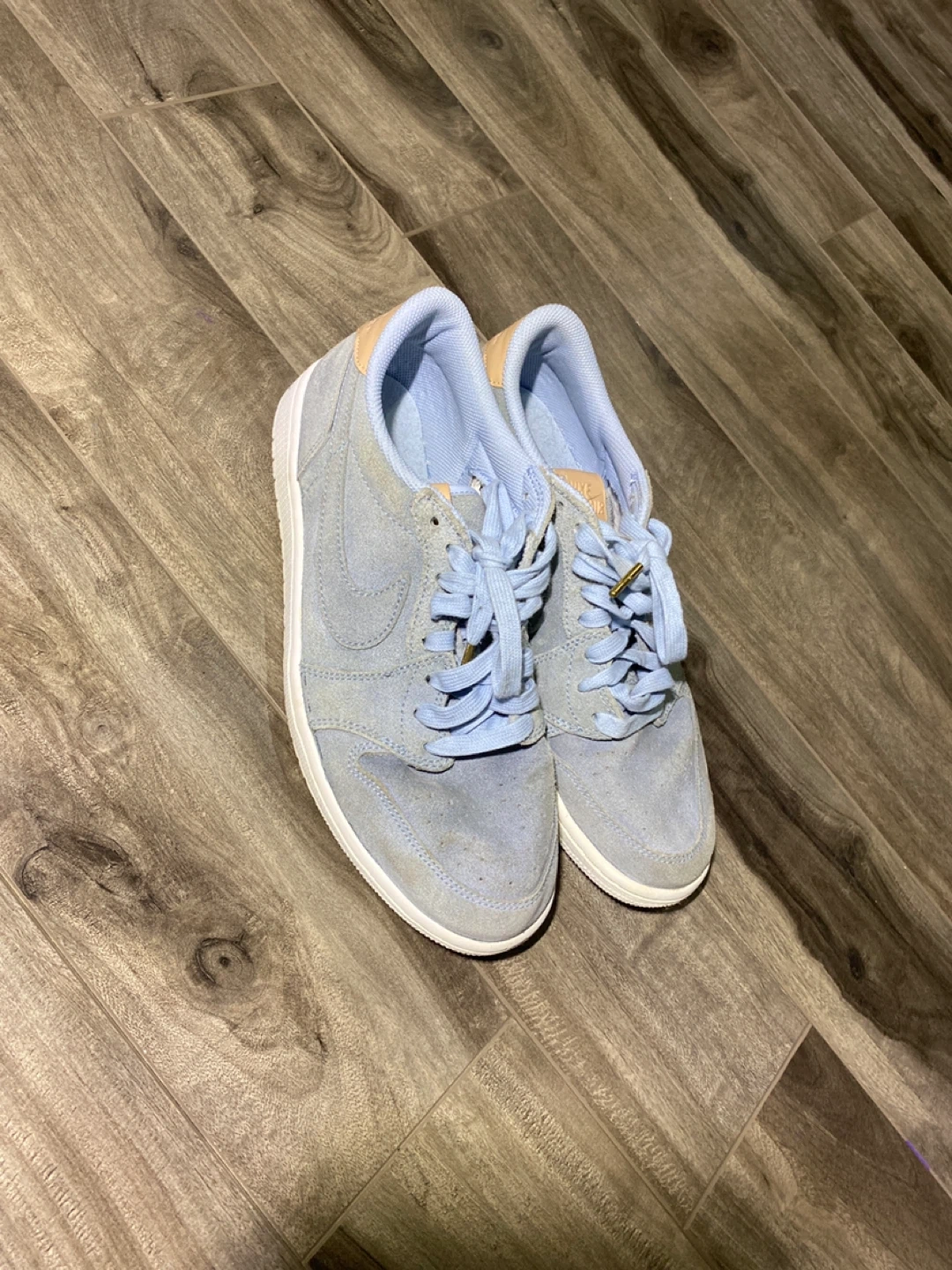 These Nike Air Jordan 1 Low sneakers come in a light blue suede. They feature a tan heel accent and white soles. These shoes are perfect for casual wear.