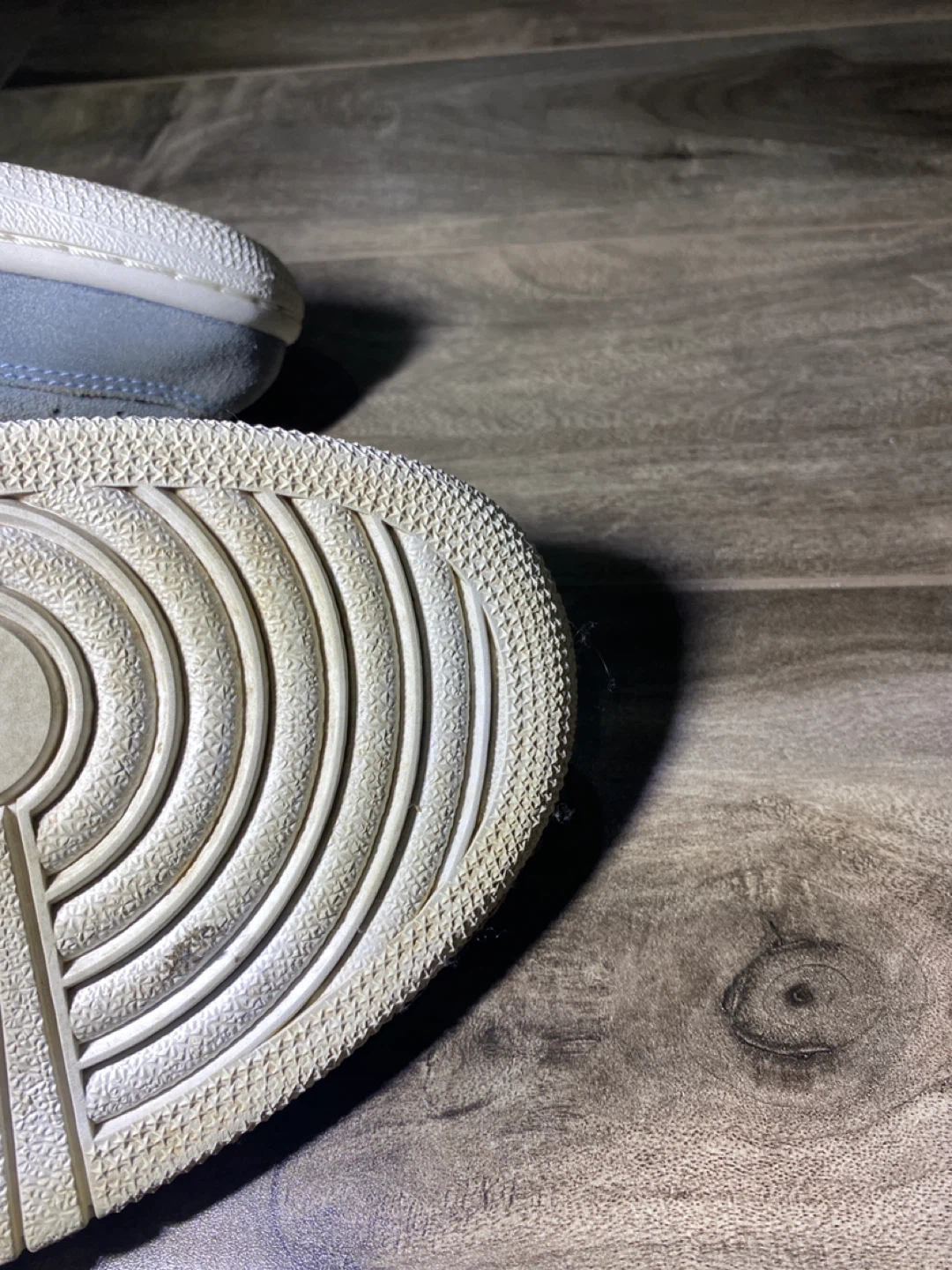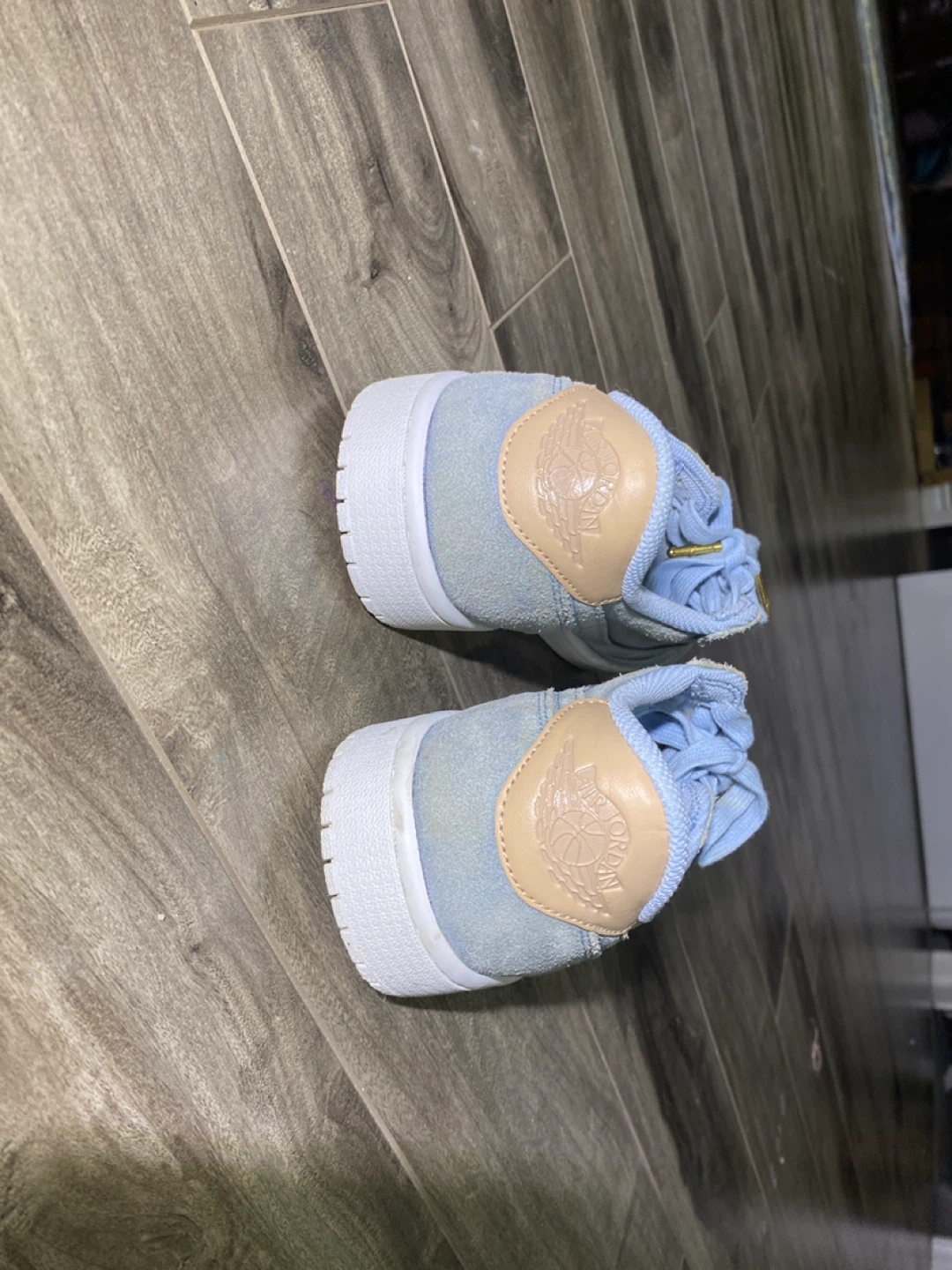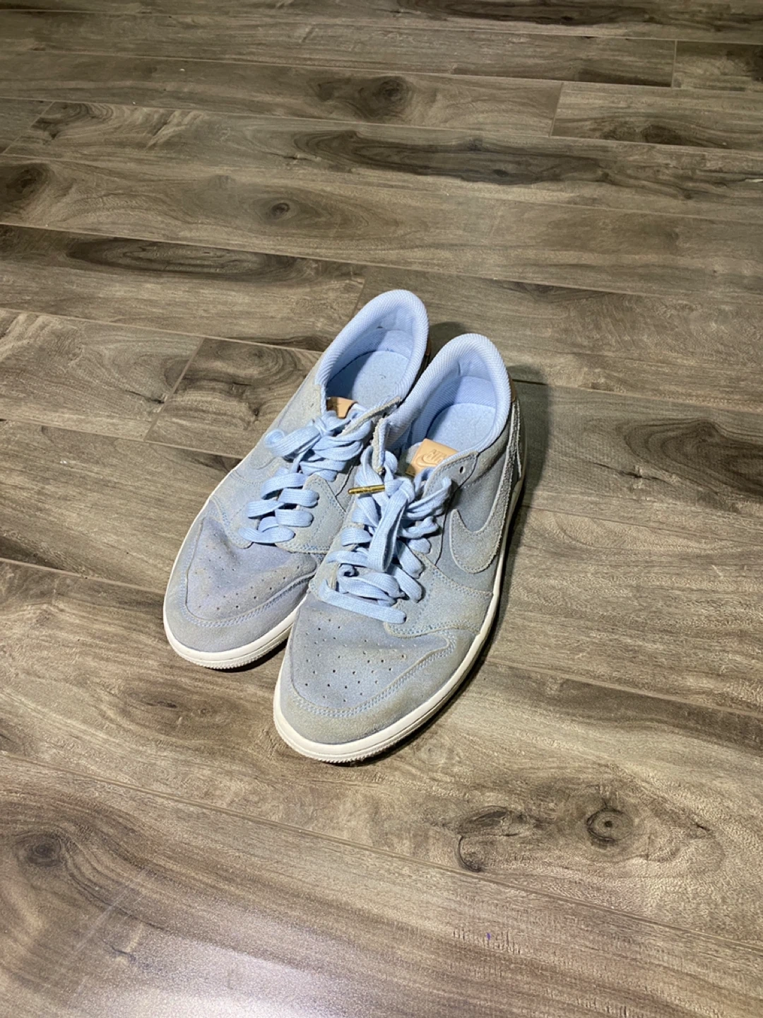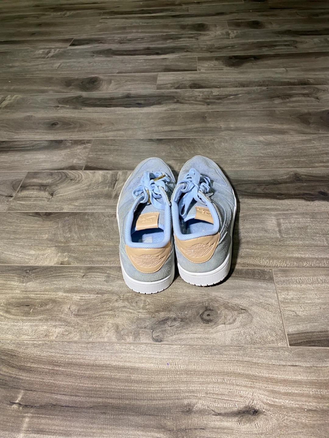 These Nike Air Jordan 1 Low sneakers come in a light blue suede. They feature a tan heel accent and white soles. These shoes are perfect for casual wear.