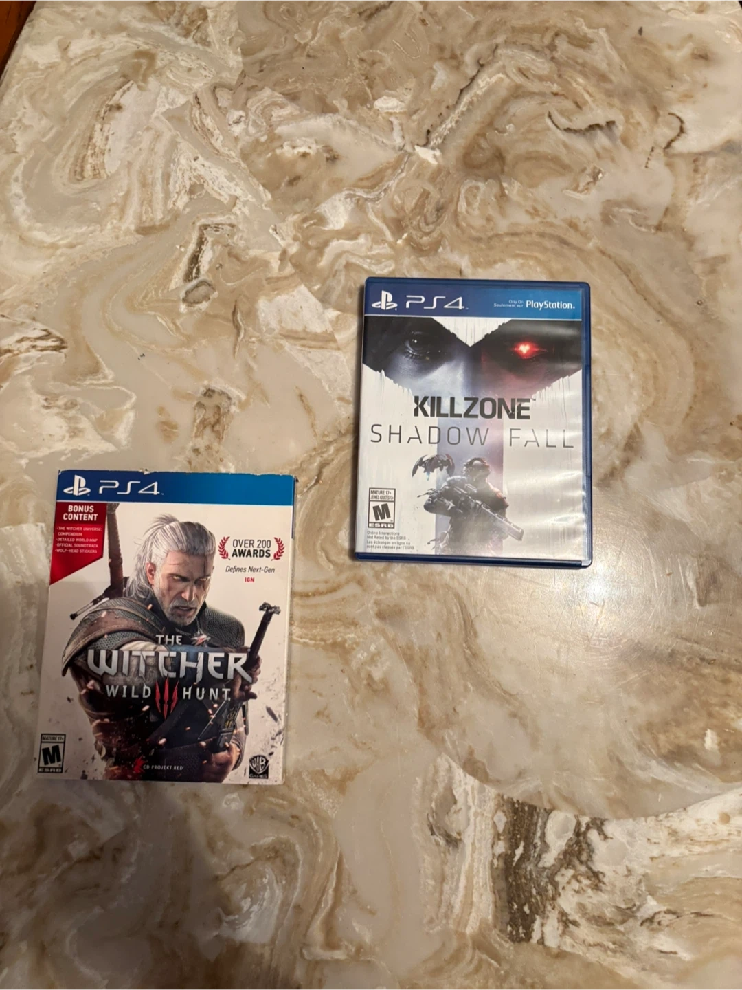 Includes Killzone Shadow Fall and The Witcher Wild Hunt for PlayStation 4. Both games are rated M for Mature. The Witcher 3 comes with bonus content, including a detailed world map and stickers.