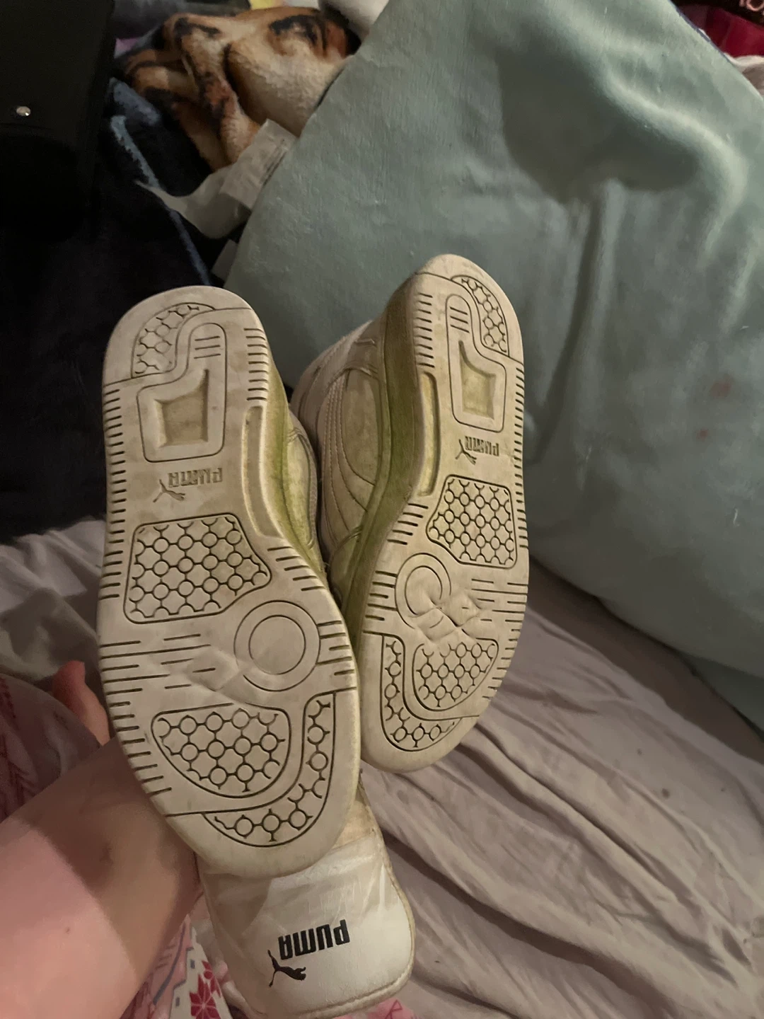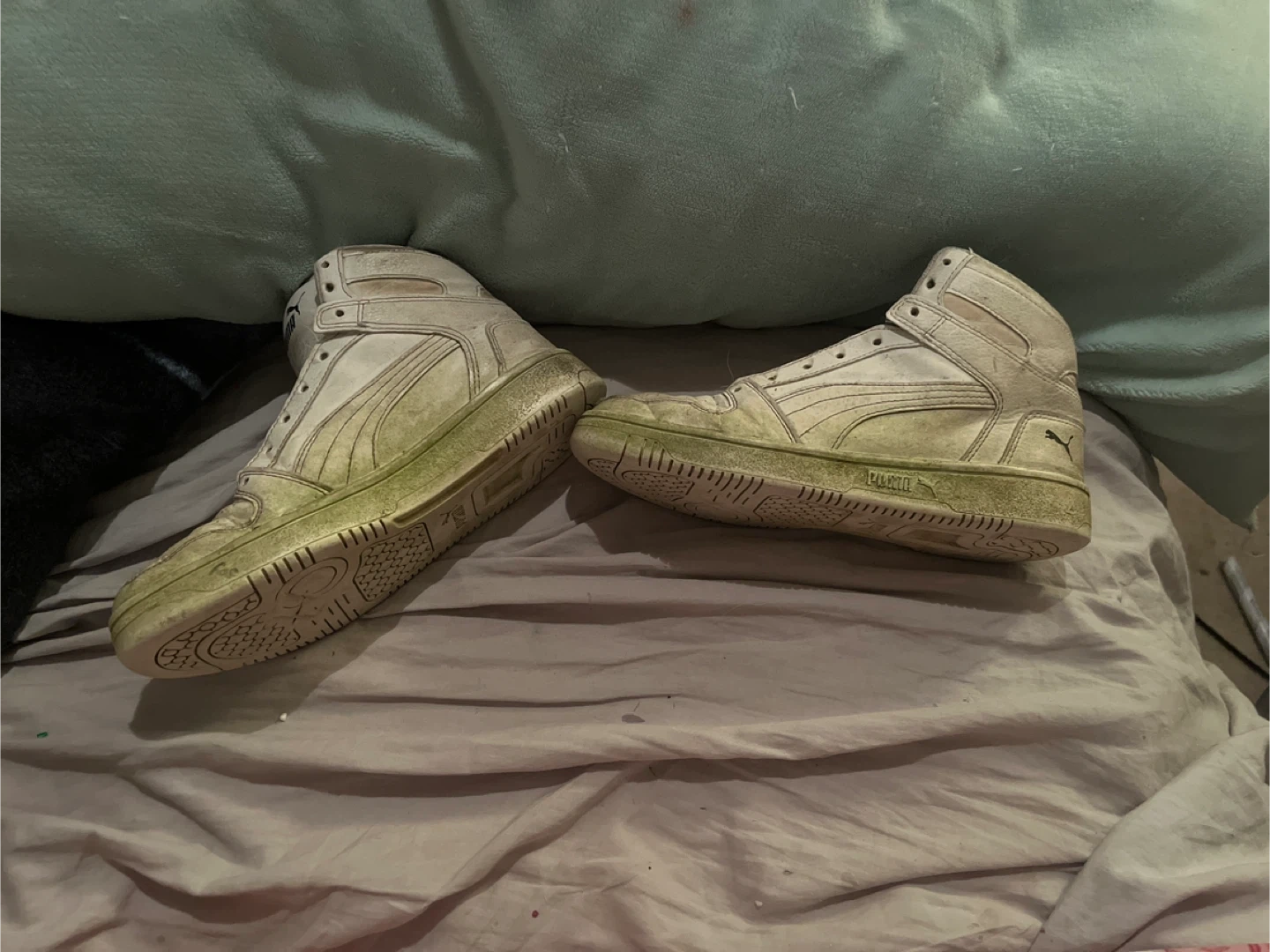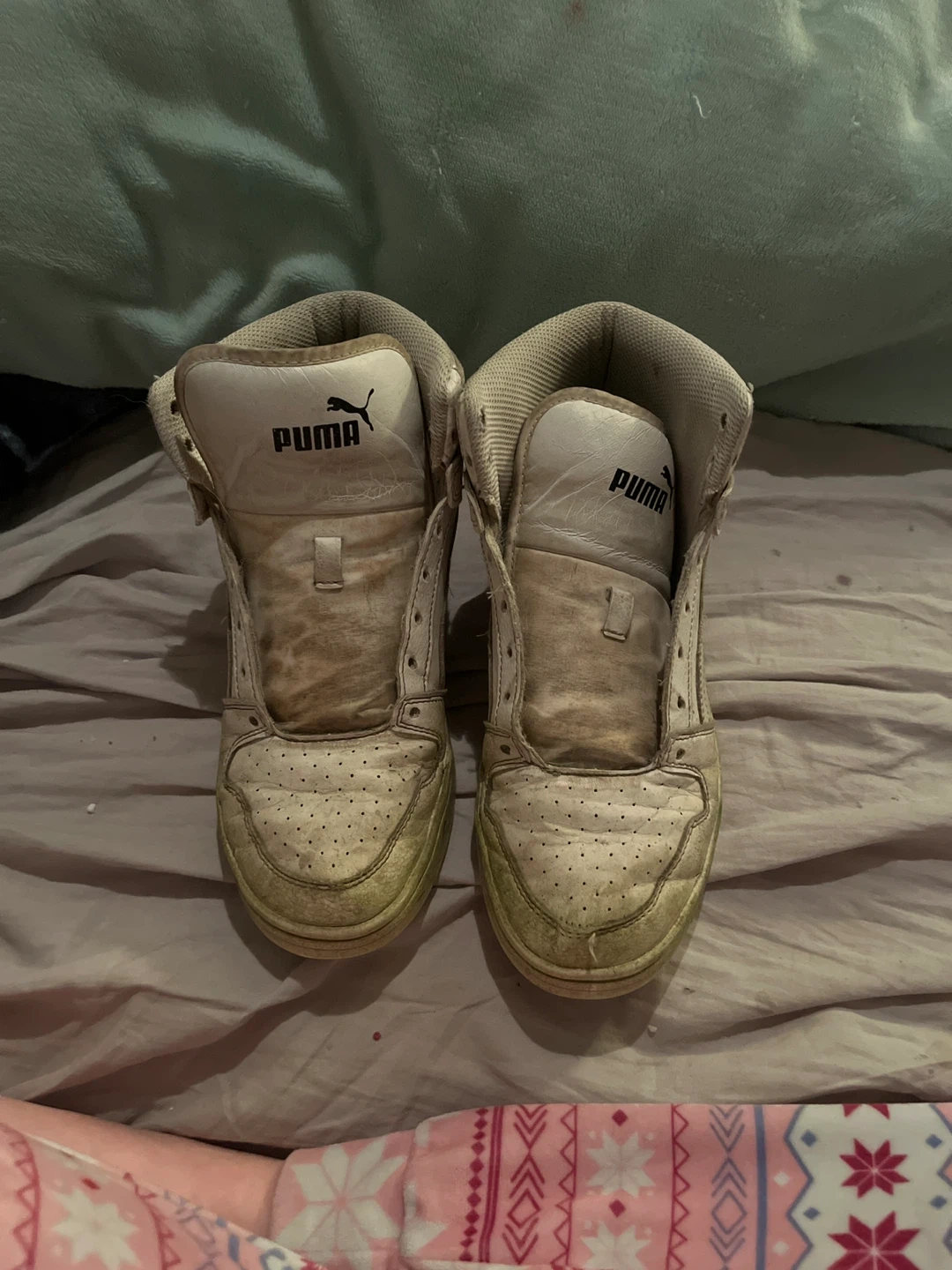 White Puma high top sneakers. These shoes have been well-loved. They are pretty beat up and will need new laces and insoles. With a good clean they could have quite a few more uses!! I’m done with them hope someone else can love them as much as I did!!!