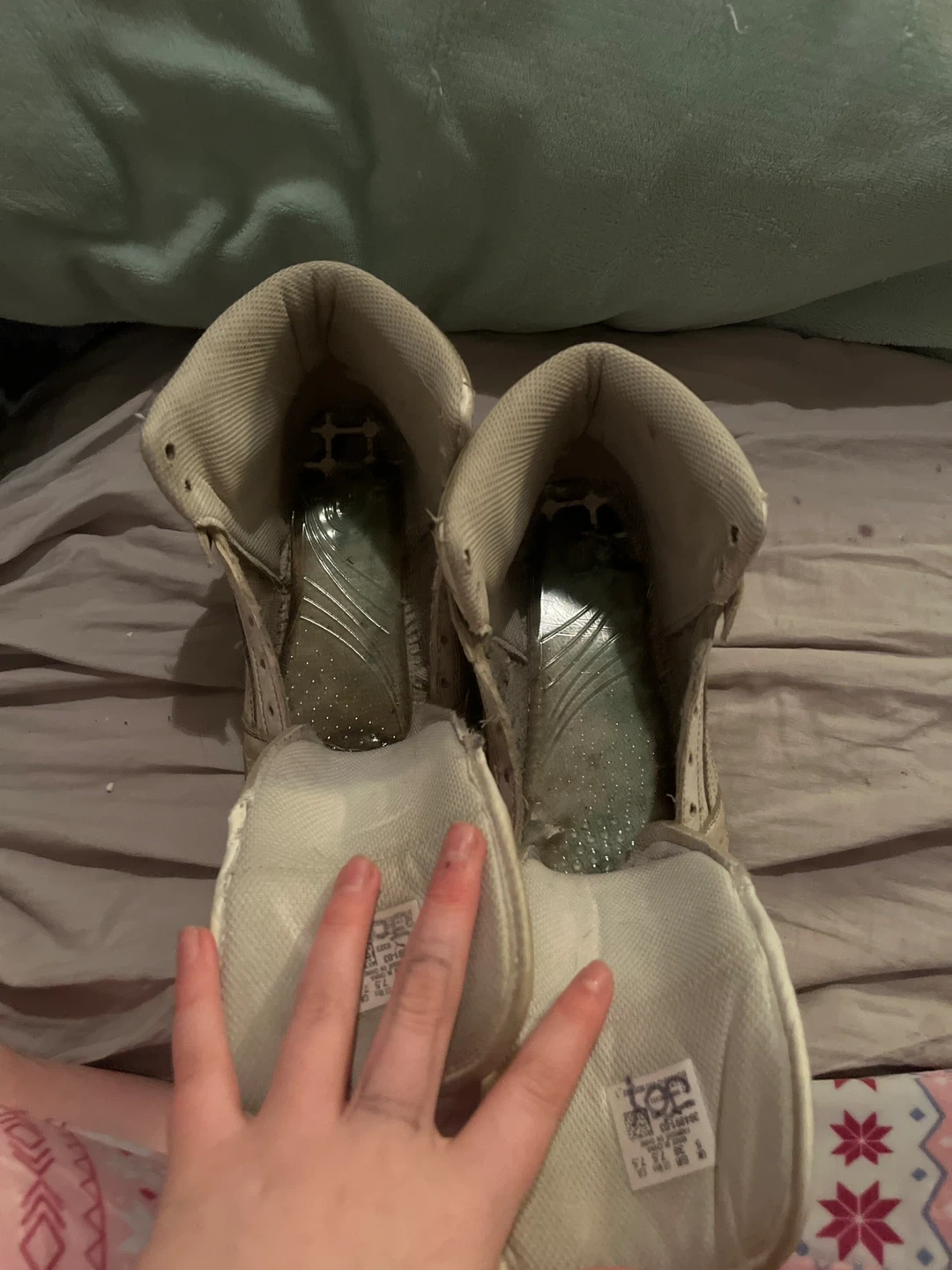 White Puma high top sneakers. These shoes have been well-loved. They are pretty beat up and will need new laces and insoles. With a good clean they could have quite a few more uses!! I’m done with them hope someone else can love them as much as I did!!!