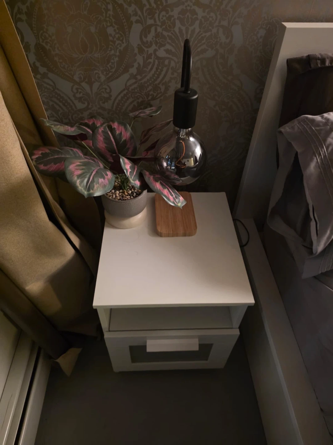 A clean, white bedside table with a single drawer and an open shelf. It's perfect for storing your essentials next to your bed. The drawer has a simple, flush handle. Including plant and light.