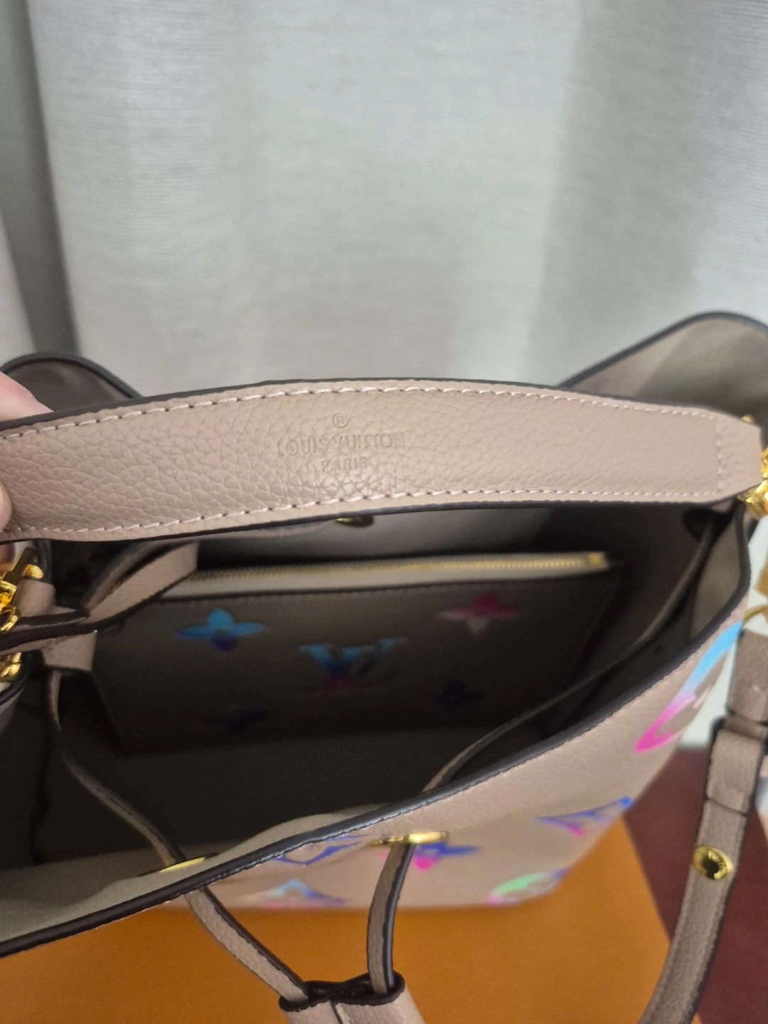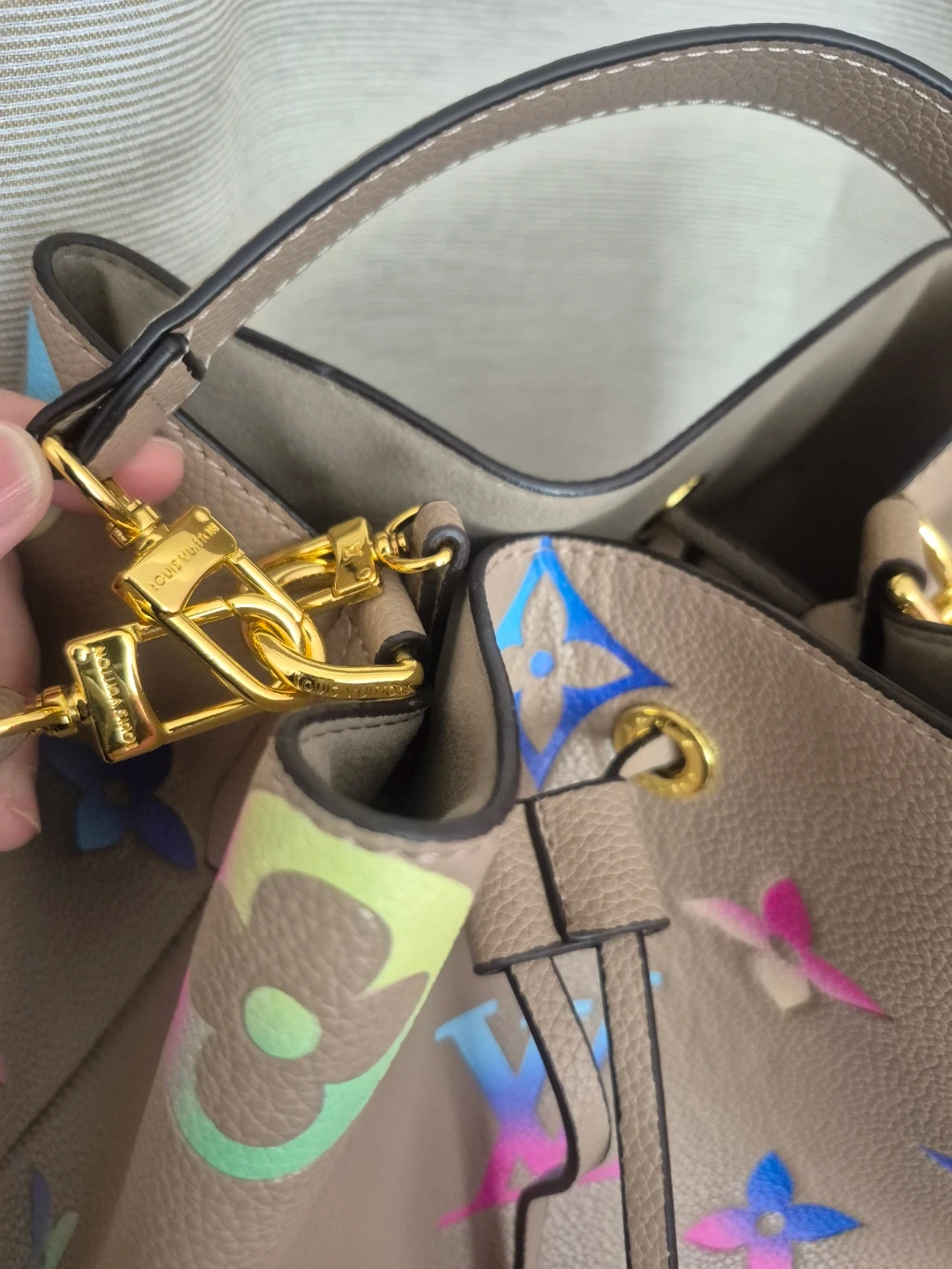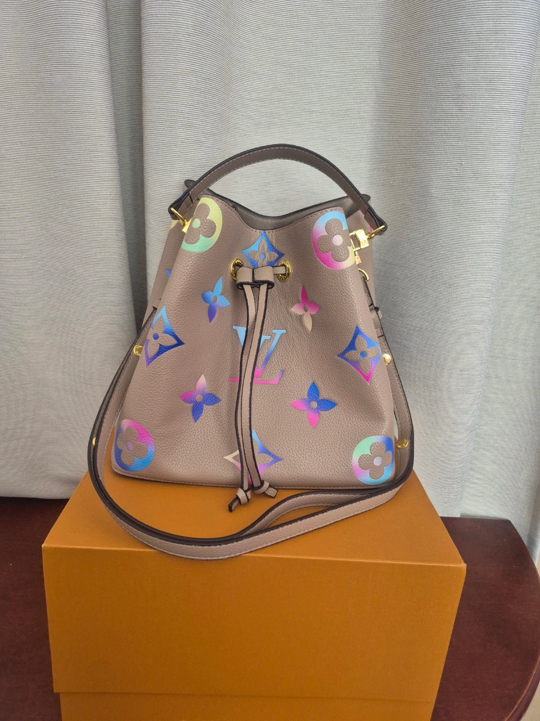 Louis Vuitton Noé BB bucket bag in beige with colourful monogram print. It features a drawstring closure and gold-tone hardware. Includes a removable pouch inside. This bag is perfect for everyday use or special occasions. ❌ Auth