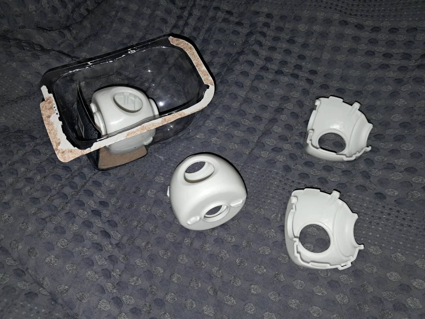 These are replacement white plastic parts for a baby monitor. It includes the main dome-shaped piece and two accessory pieces. The original packaging is included, three grip n twist