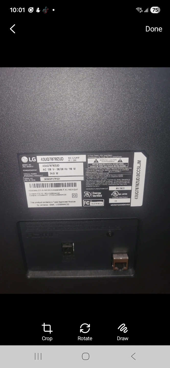 LG 43 inch 4K UHD Smart TV model 43UQ7070ZUD. The screen is cracked and needs repair. This TV features built-in apps and a smart interface. Comes with remote.