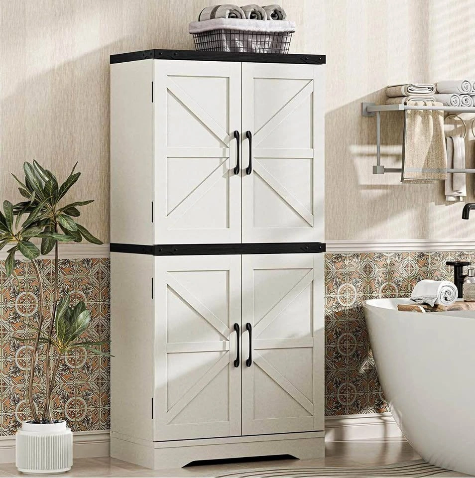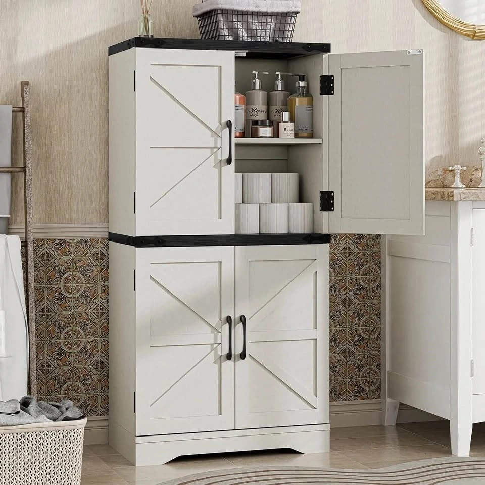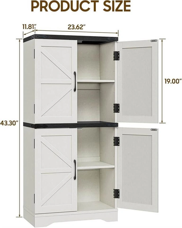Brand new, never used cabinet in a box. This farmhouse-style cabinet combines upper open storage, a middle drawer, and a lower cabinet to keep your essentials organized. Adjustable wooden shelves offer flexible storage for bathrooms, living rooms, or hallways. Built with sturdy materials, it features a white cabinet body and a thick top board in black, accented with decorative angle iron for added strength and style. The solid top provides a stable surface for décor or daily essentials. Designed for everyday convenience, the cabinet includes an easy-access drawer, adjustable interior shelving, and open storage for frequently used items. Its rustic farmhouse look blends seamlessly with modern or traditional décor.