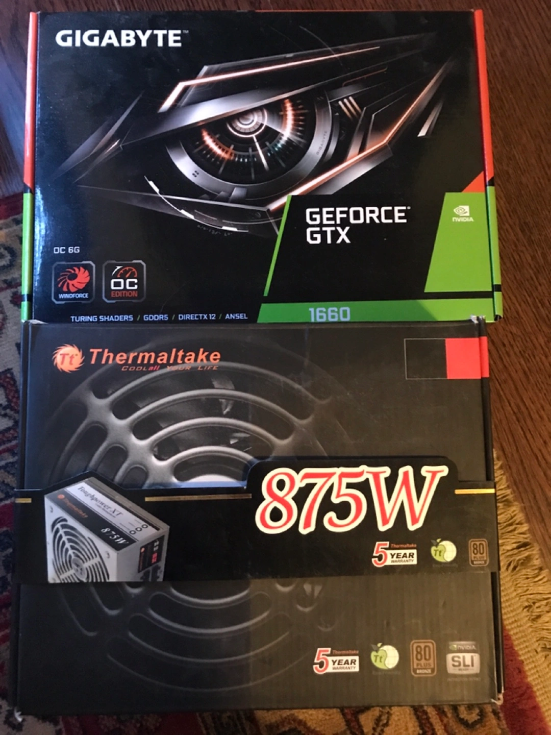 Custom built PC featuring a Gigabyte Z370 HD3 motherboard and NVIDIA GeForce GTX 1660 OC graphics card. It includes 2x 250GB Samsung 840 EVO SSDs and 2x Corsair Vengeance LPX DDR4 RAM sticks. The system is powered by a Thermaltake 875W 80+ Platinum PSU. This build is great for gaming and demanding tasks!