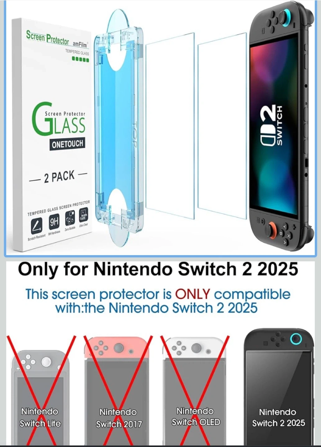 These are amFilm tempered glass screen protectors. Designed for Nintendo Switch 2 2025 models. Includes accessory kits for installation. Includes a lifetime warranty.