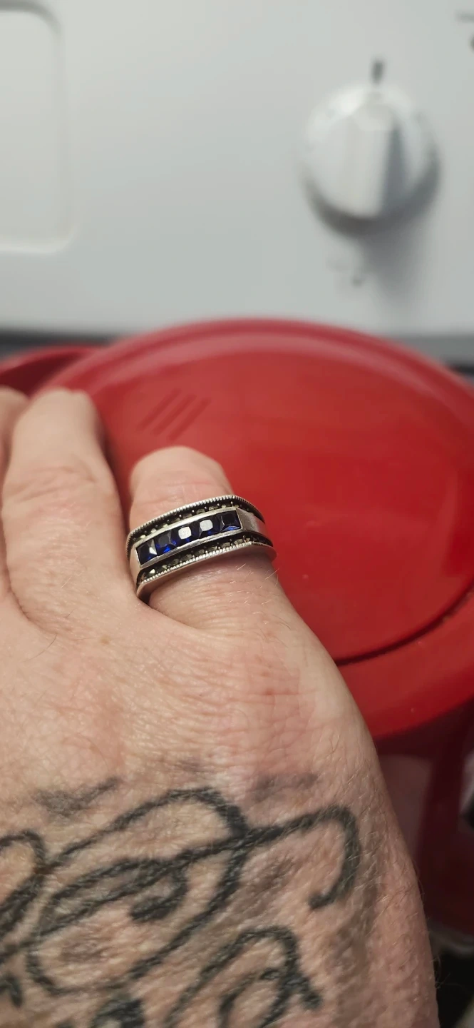 This men's ring features a sterling silver band with a row of sparkling blue sapphire stones. The detailed etching along the edges adds a touch of sophistication. It's a stylish accessory for everyday wear or special occasions.