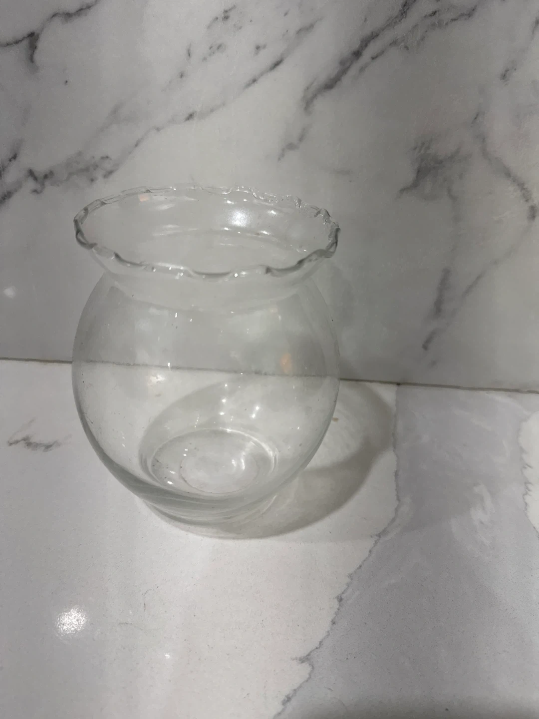 Clear glass bud vase with a scalloped rim. It's made of glass. This vase is suitable for a single stem or small floral arrangement.