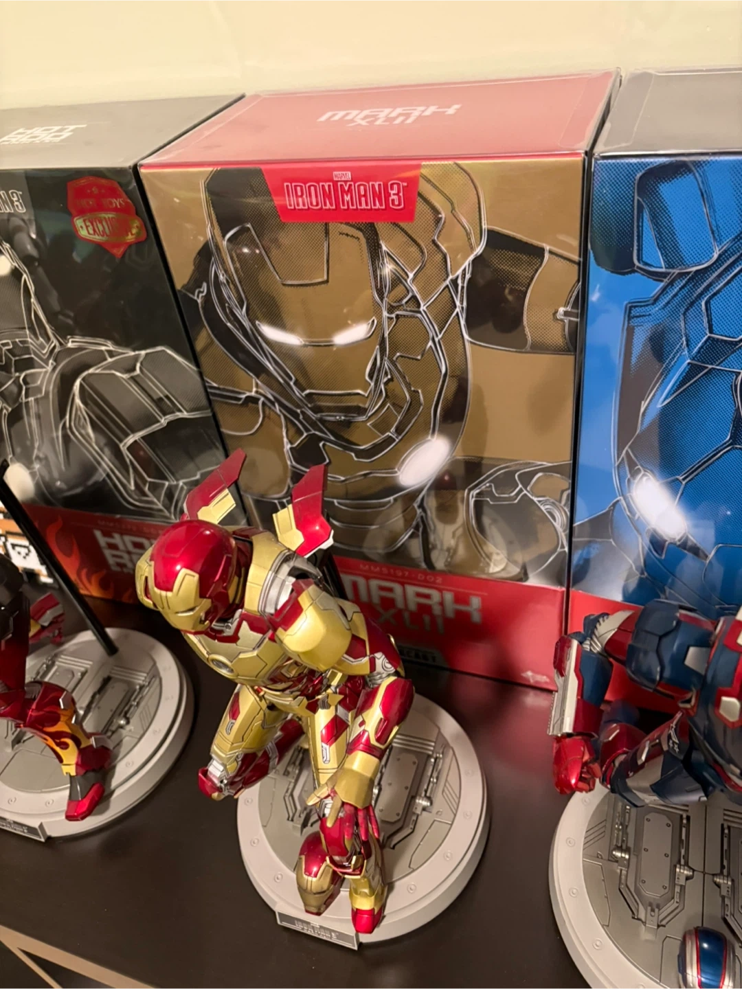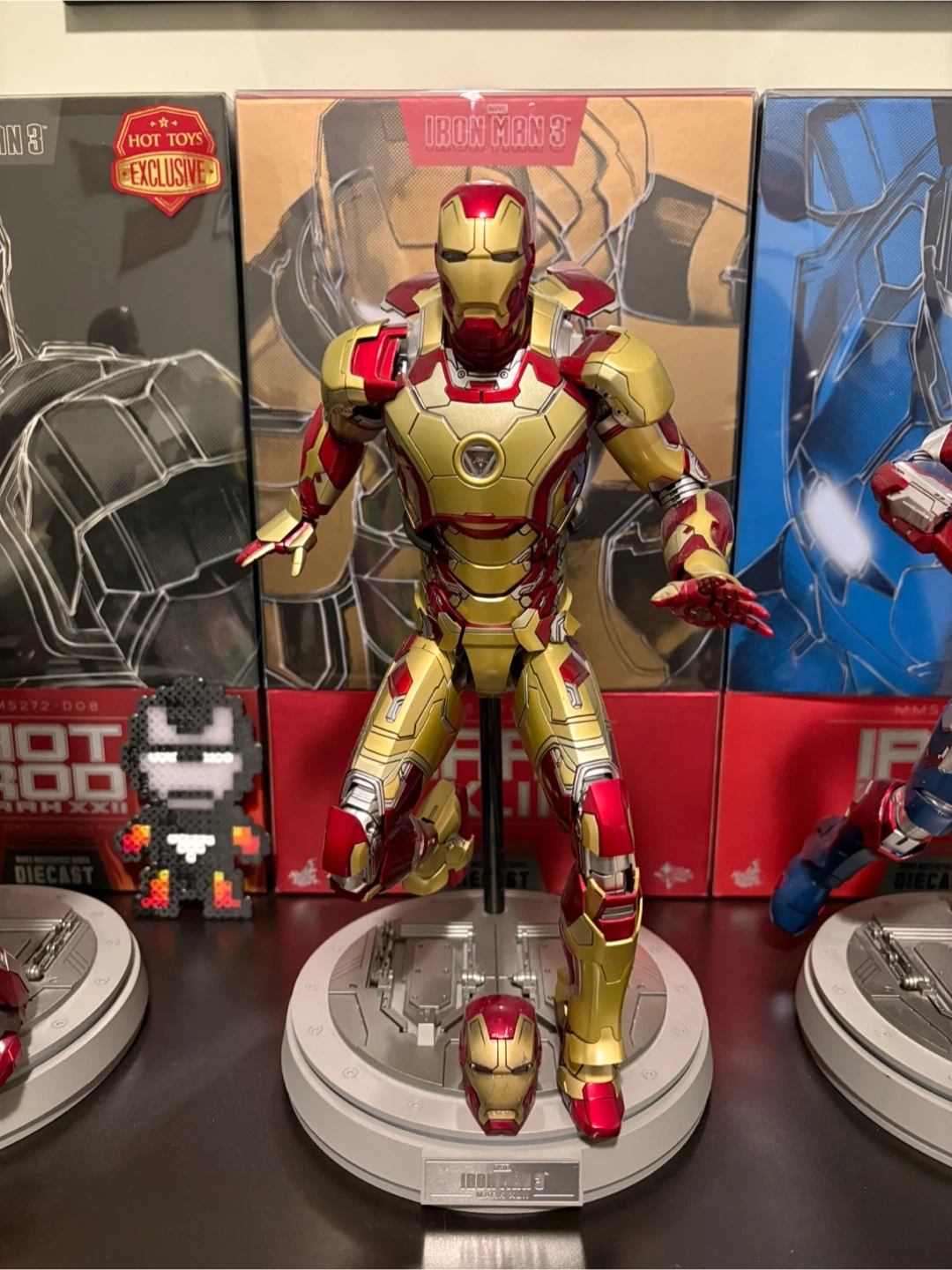 This is a Hot Toys sixth scale collectible figure of Iron Man Mark XLII from Iron Man 3. It's incredibly detailed, capturing the iconic suit from the movie. The figure comes with its original display stand and accessories, all housed in its original packaging.