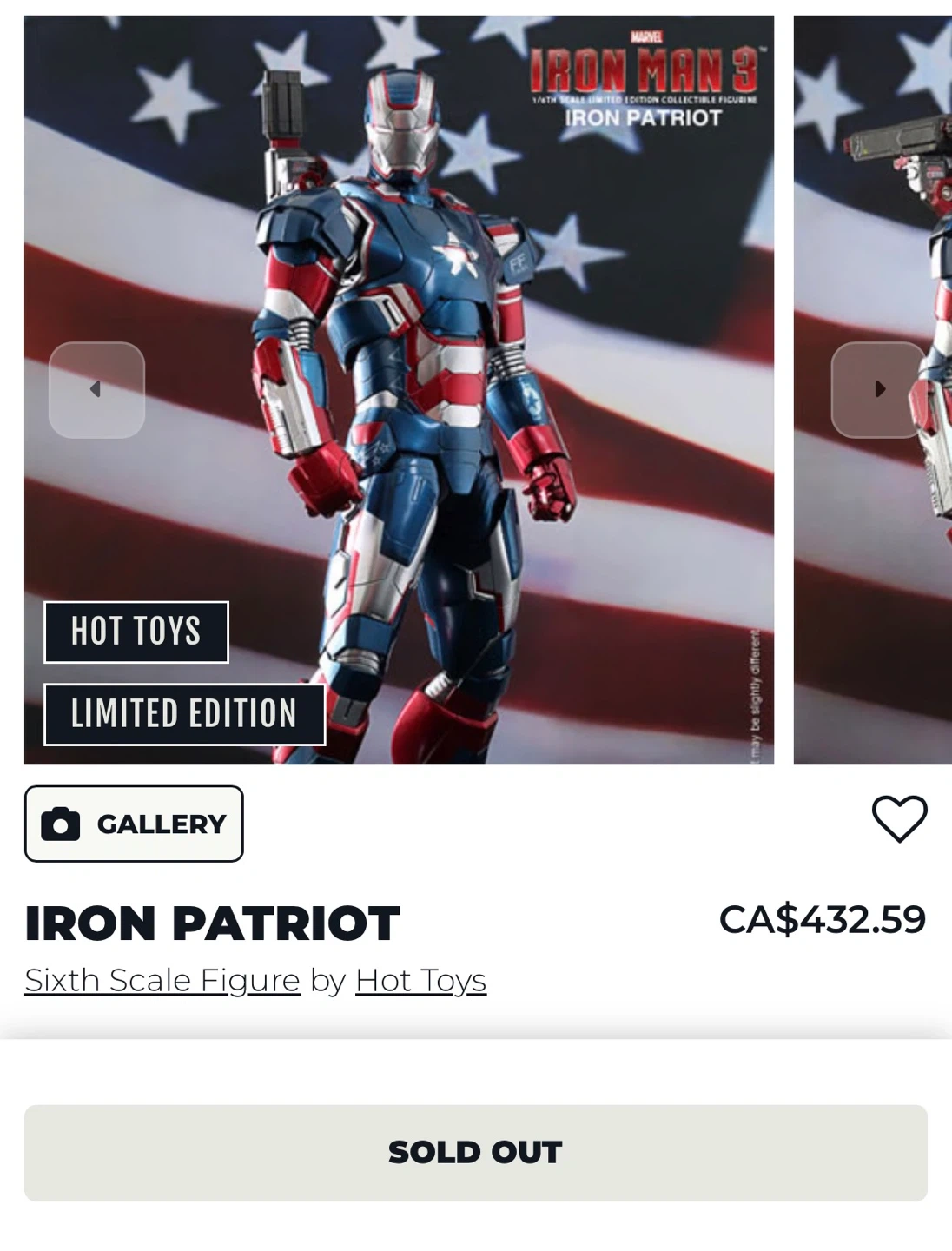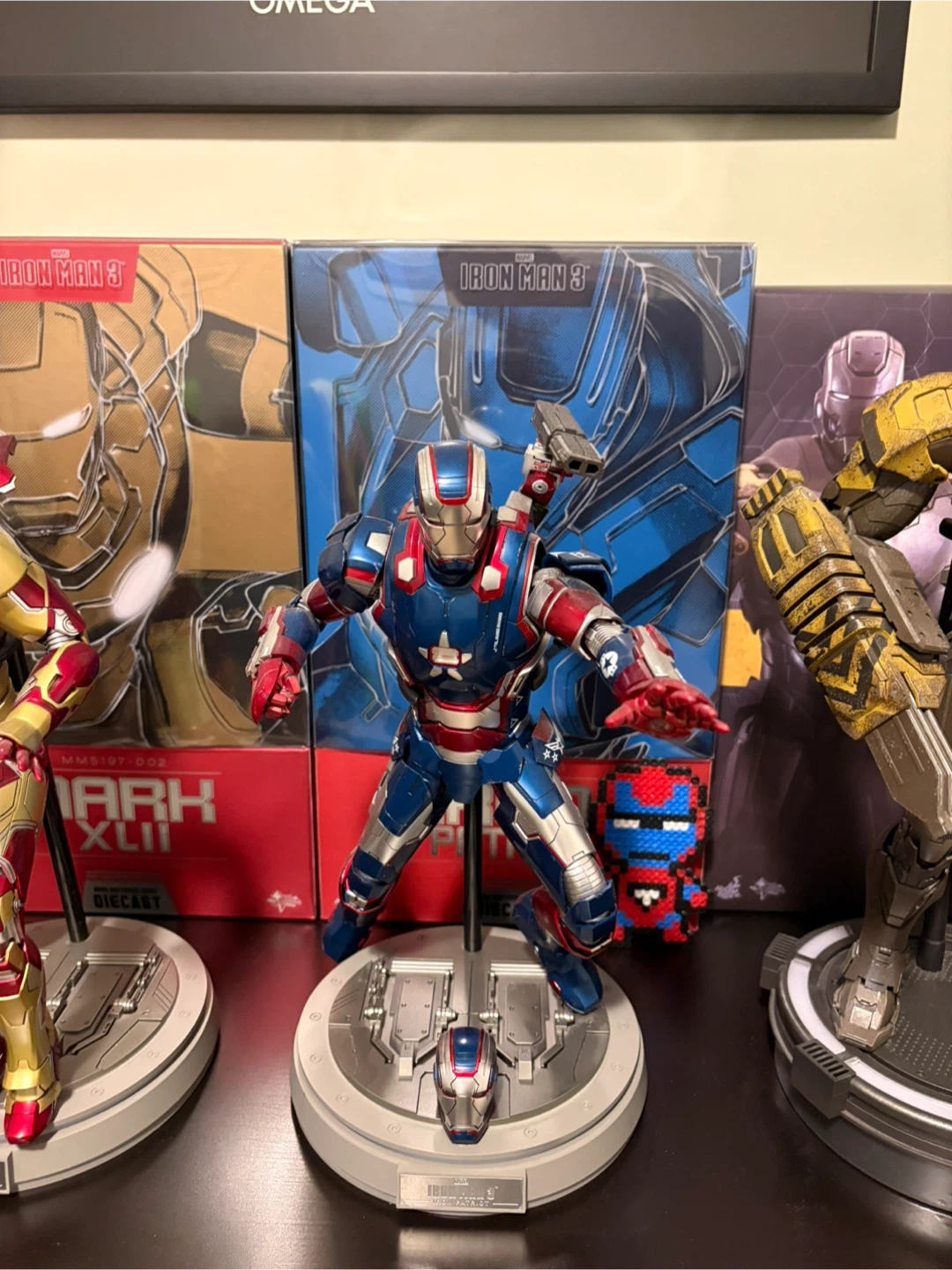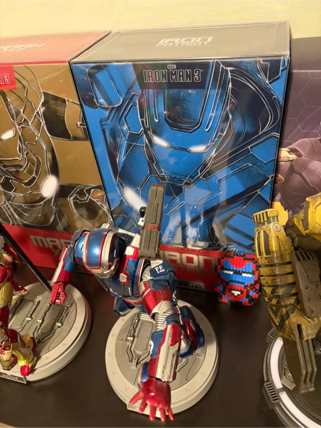 This is the Hot Toys Iron Patriot Sixth Scale Figure from Iron Man 3. It's a limited edition collectible. The figure includes its display stand. This collectible is for fans of the Marvel Cinematic Universe.
