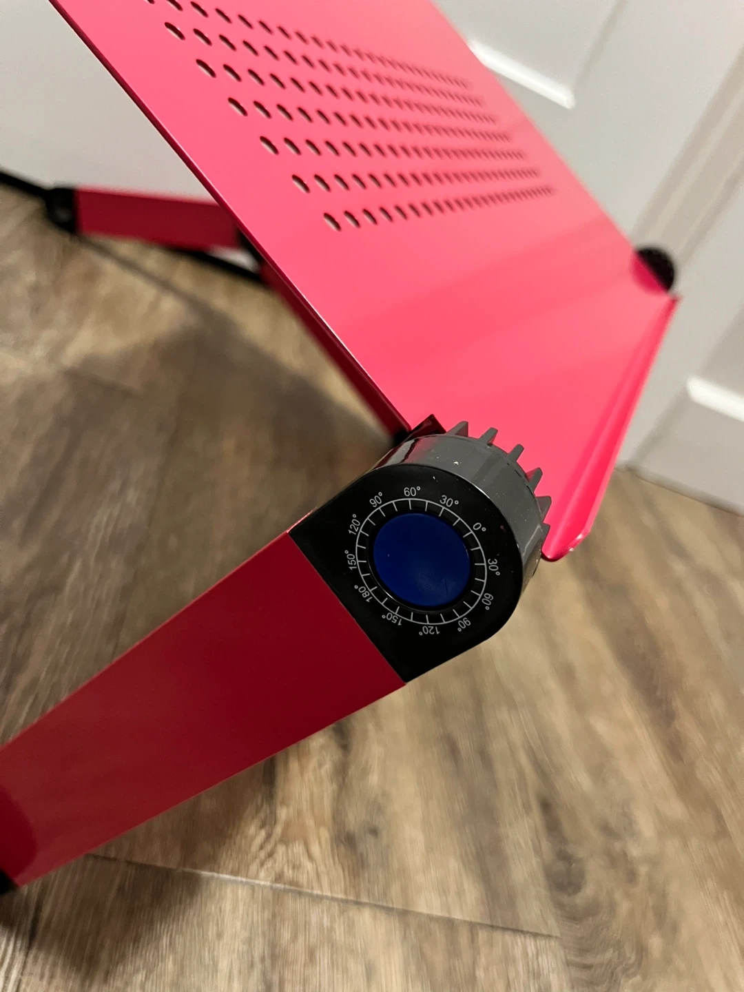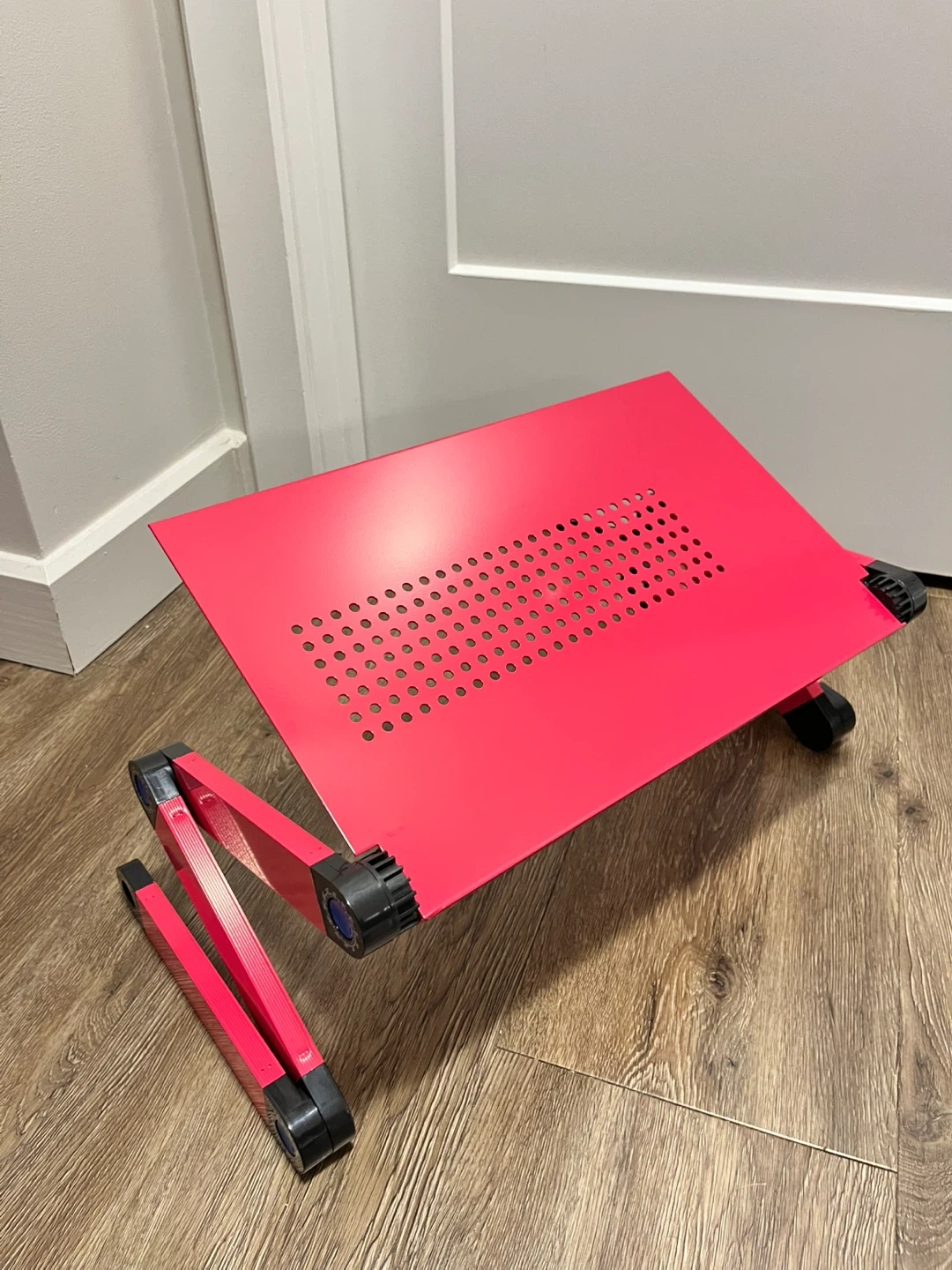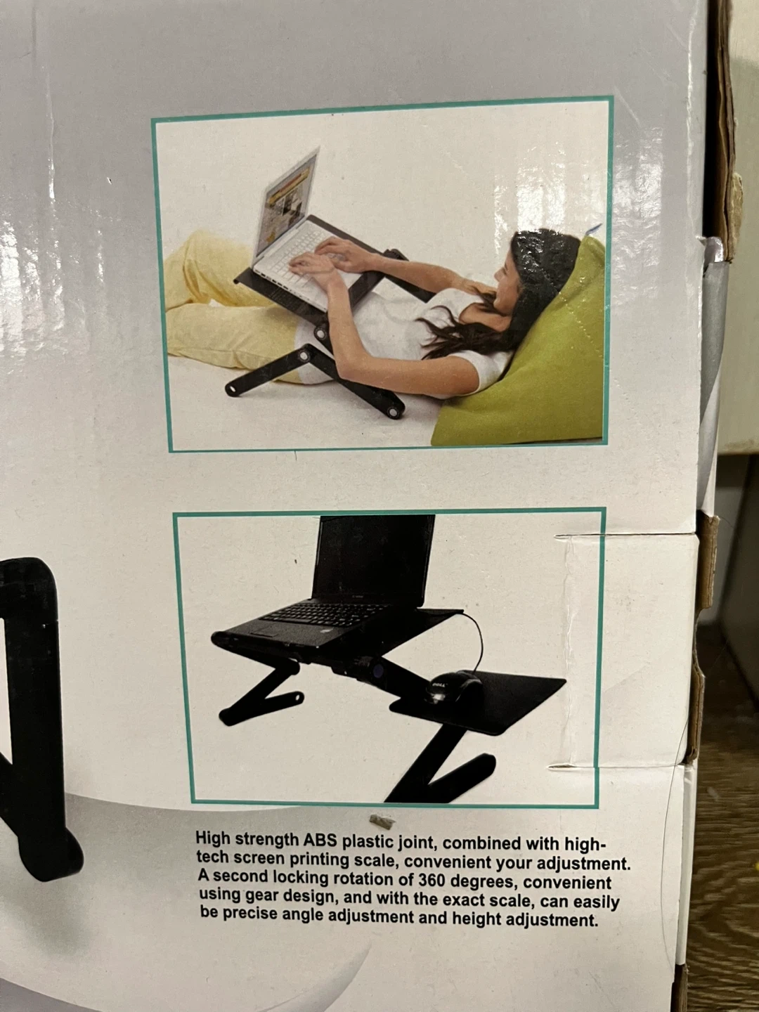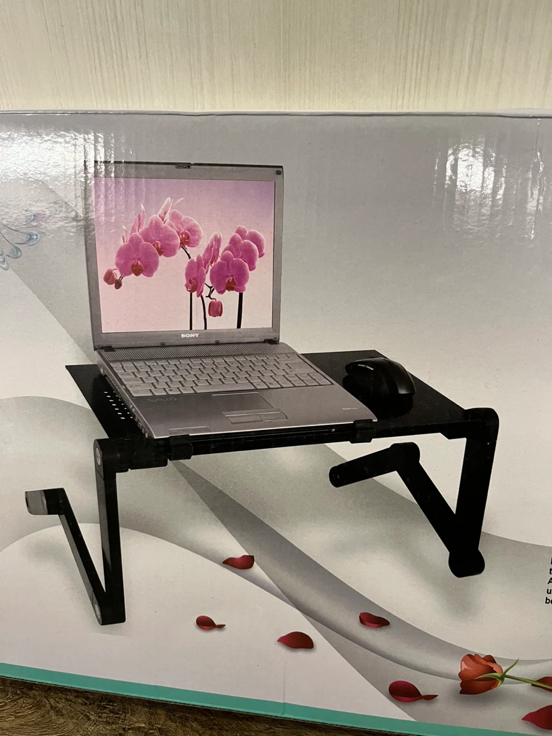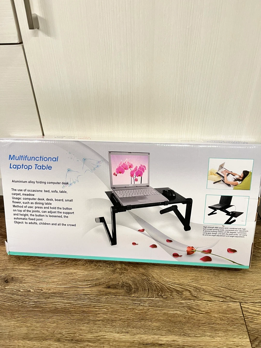 This is a multifunctional aluminium alloy folding laptop desk. It's made from high strength ABS plastic and aluminium alloy. It offers a second locking rotation of 360 degrees for convenient adjustment. This table can be used on a bed, sofa, or desk.