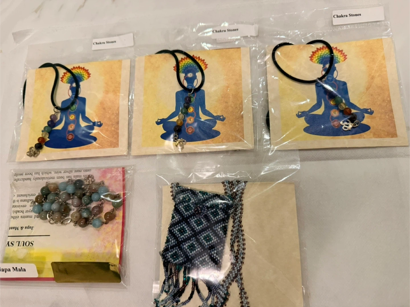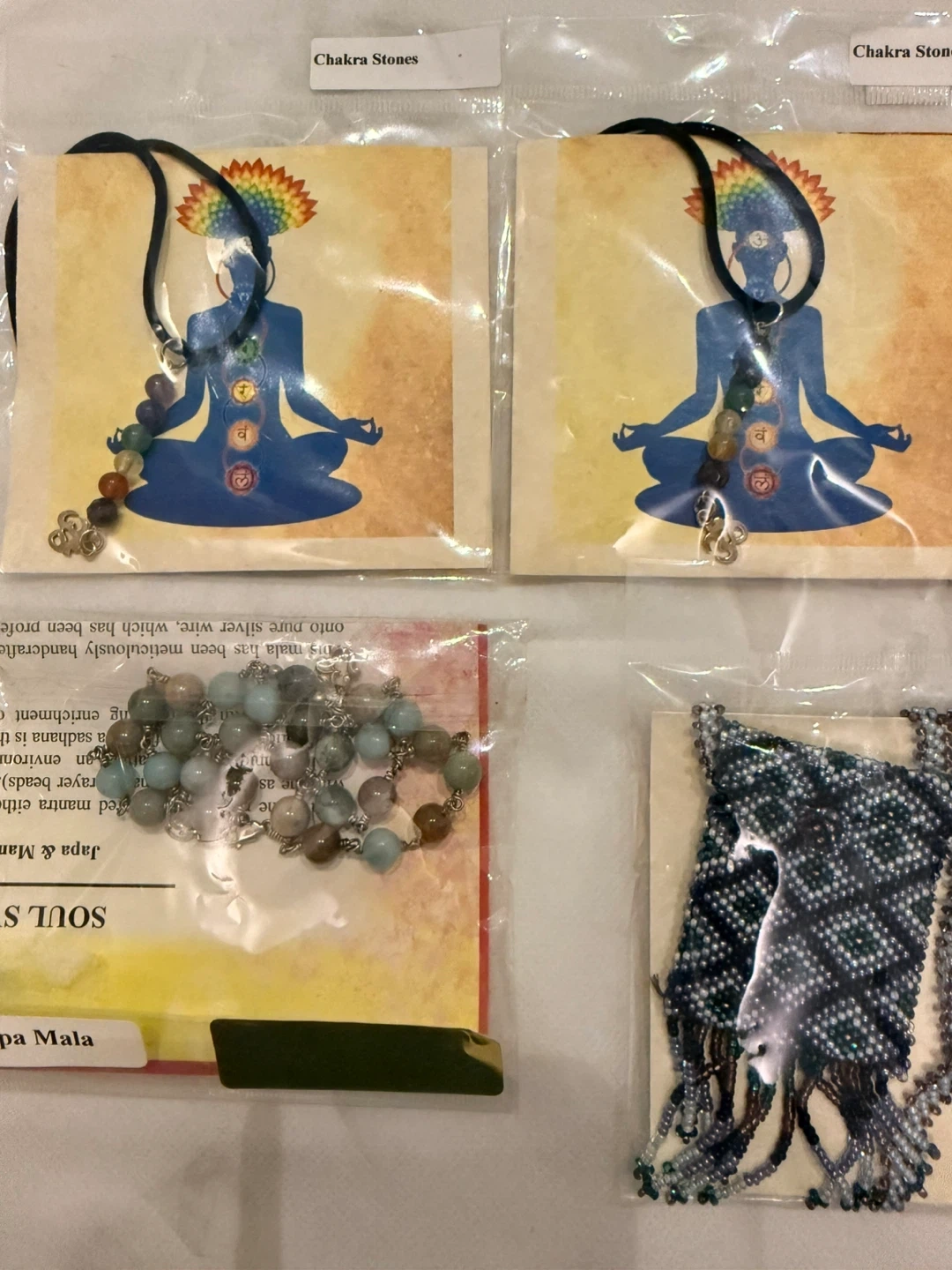 Variety of chakra stone sets, each containing 7 stones in a bag with a chart. Also includes malas and beaded necklaces. Stones include amethyst, clear quartz, carnelian, aventurine, and more. Great for energy work and meditation!