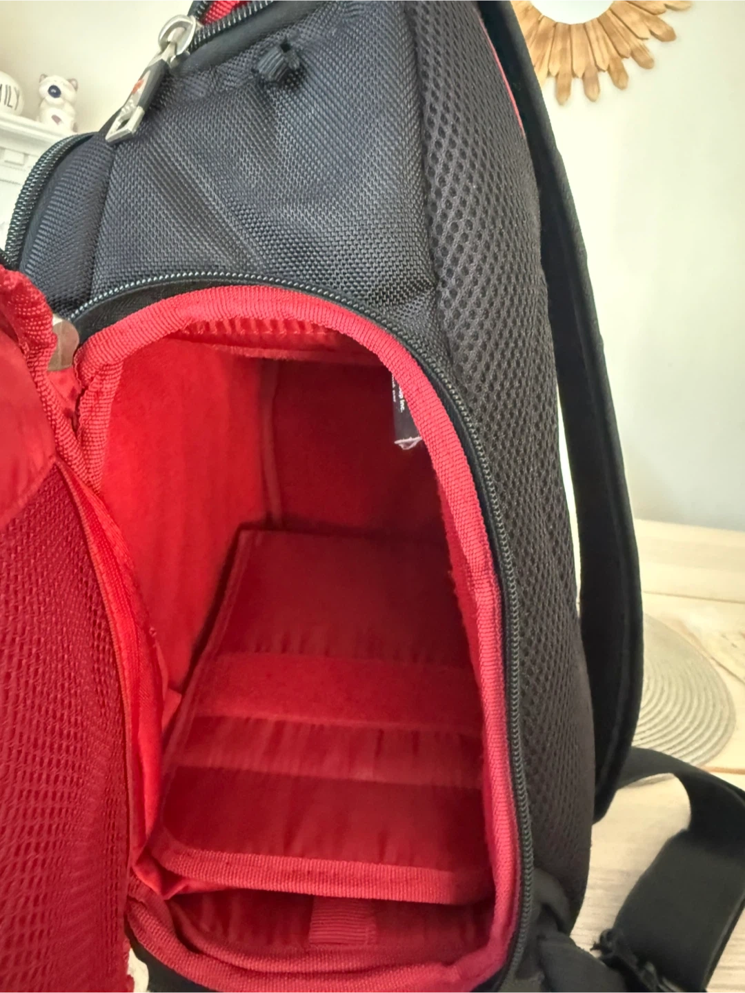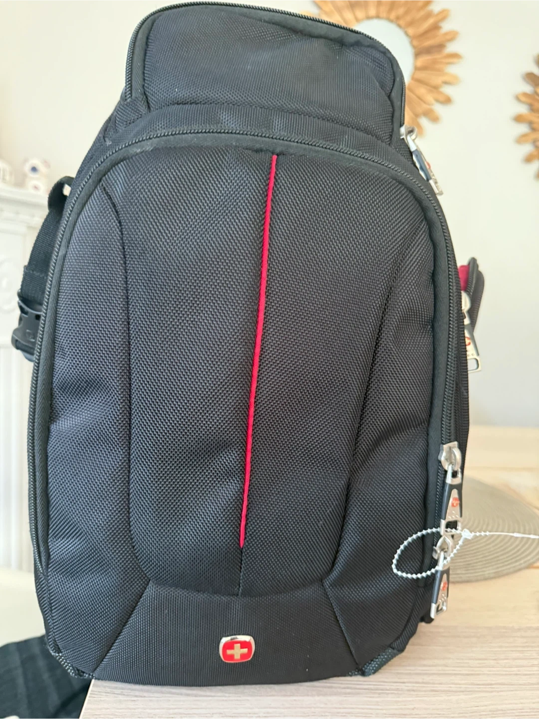 This black and red Swiss Gear backpack is designed for carrying camera gear. It features a padded interior with adjustable dividers. Multiple pockets and compartments offer storage for accessories.