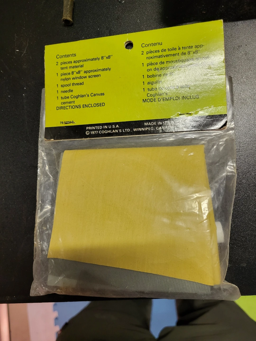 This Coghlan's tent repair kit is for small emergency repairs. It includes two pieces of approximately 8"x8" tent material, one piece of approximately 8"x8" nylon window screen, one spool of thread, one needle, and one tube of Coghlan's Canvas Cement. Directions are enclosed.