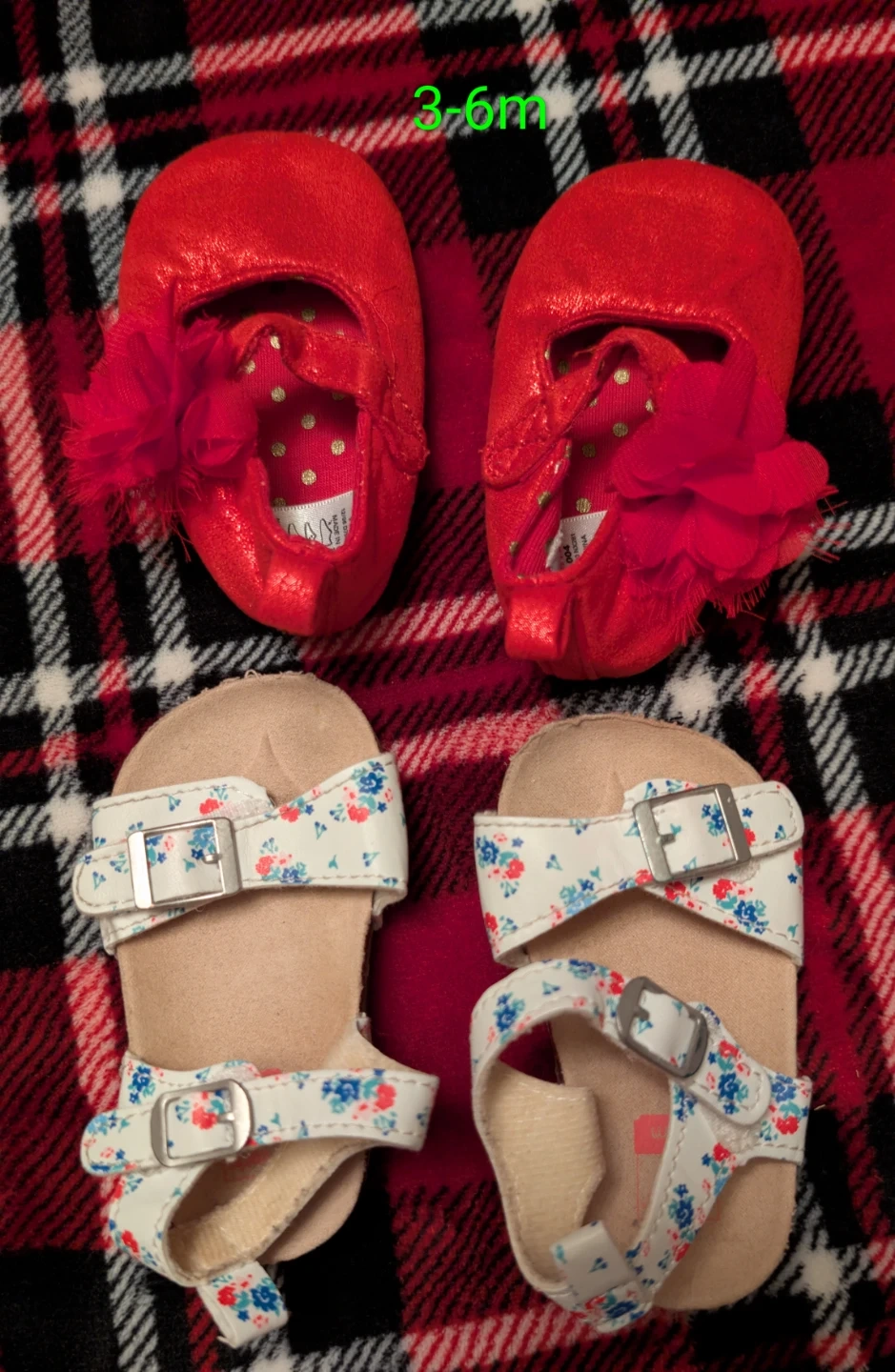 This listing includes a pair of red with a flower accent and a pair of white floral print sandals. The red shoes are size 3-6 months.