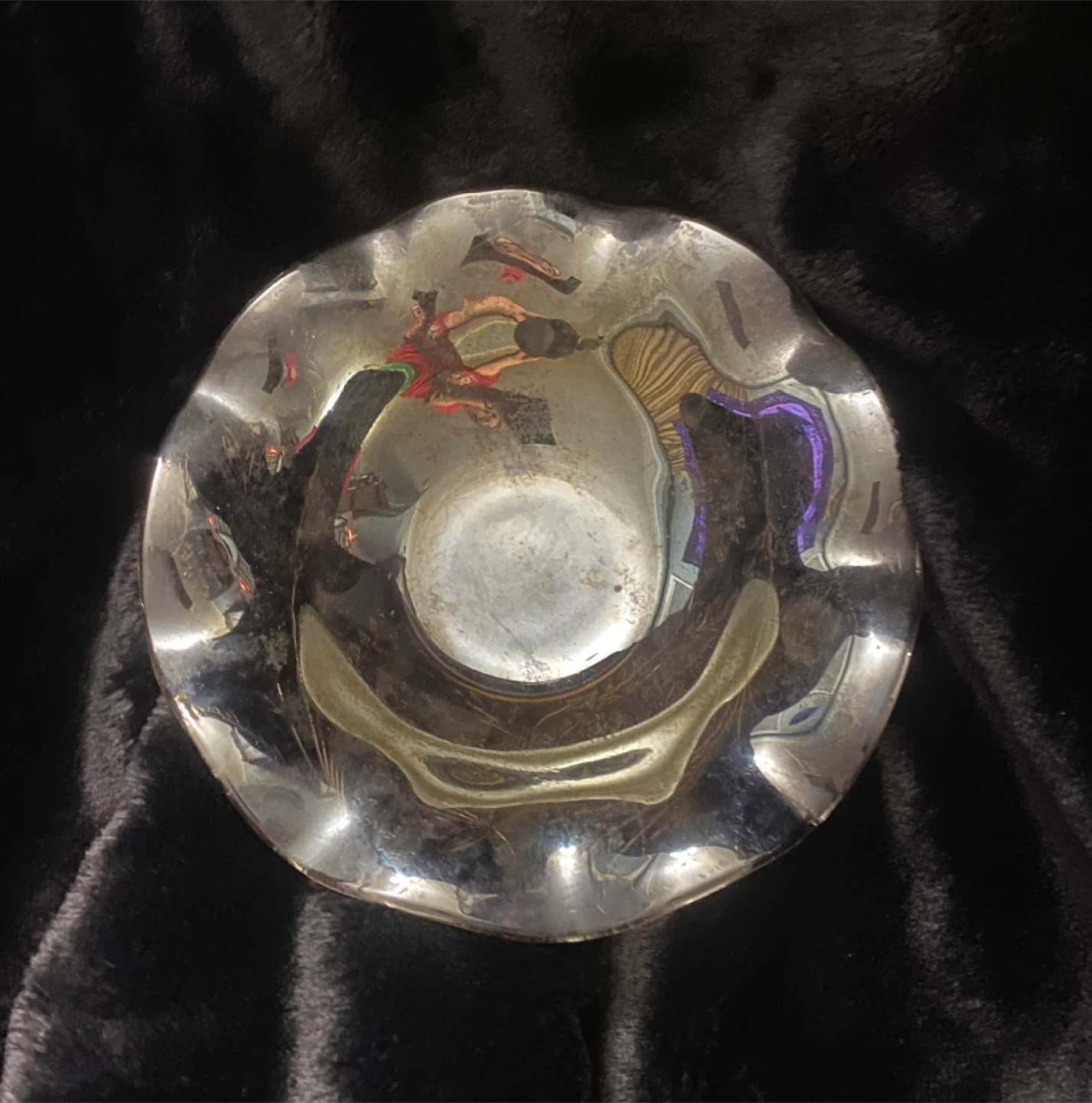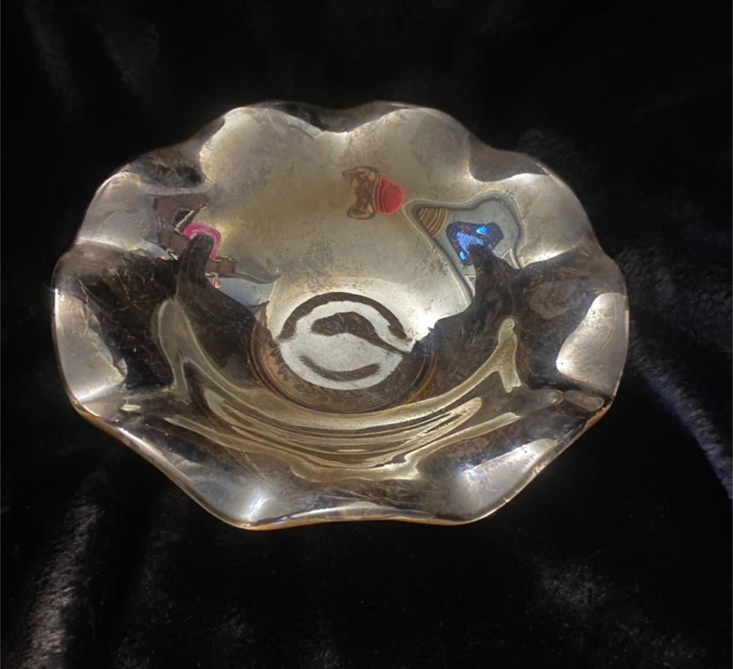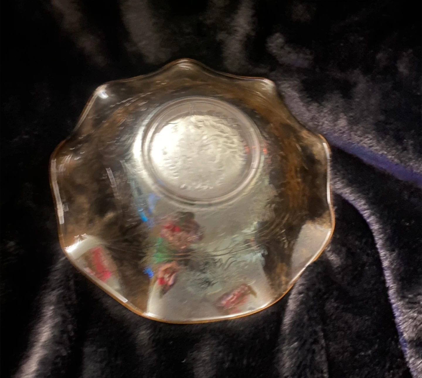 This is a lovely glass dish with a scalloped edge and an embossed floral pattern. It's perfect for serving candies or small snacks. The glass has a warm amber hue.