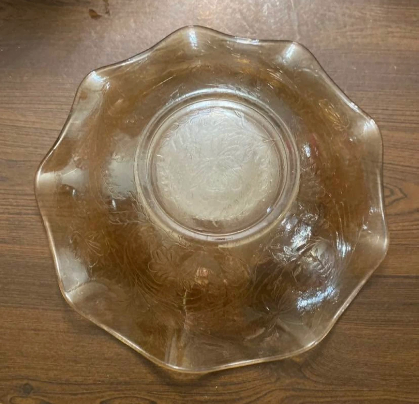 This is a lovely glass dish with a scalloped edge and an embossed floral pattern. It's perfect for serving candies or small snacks. The glass has a warm amber hue.