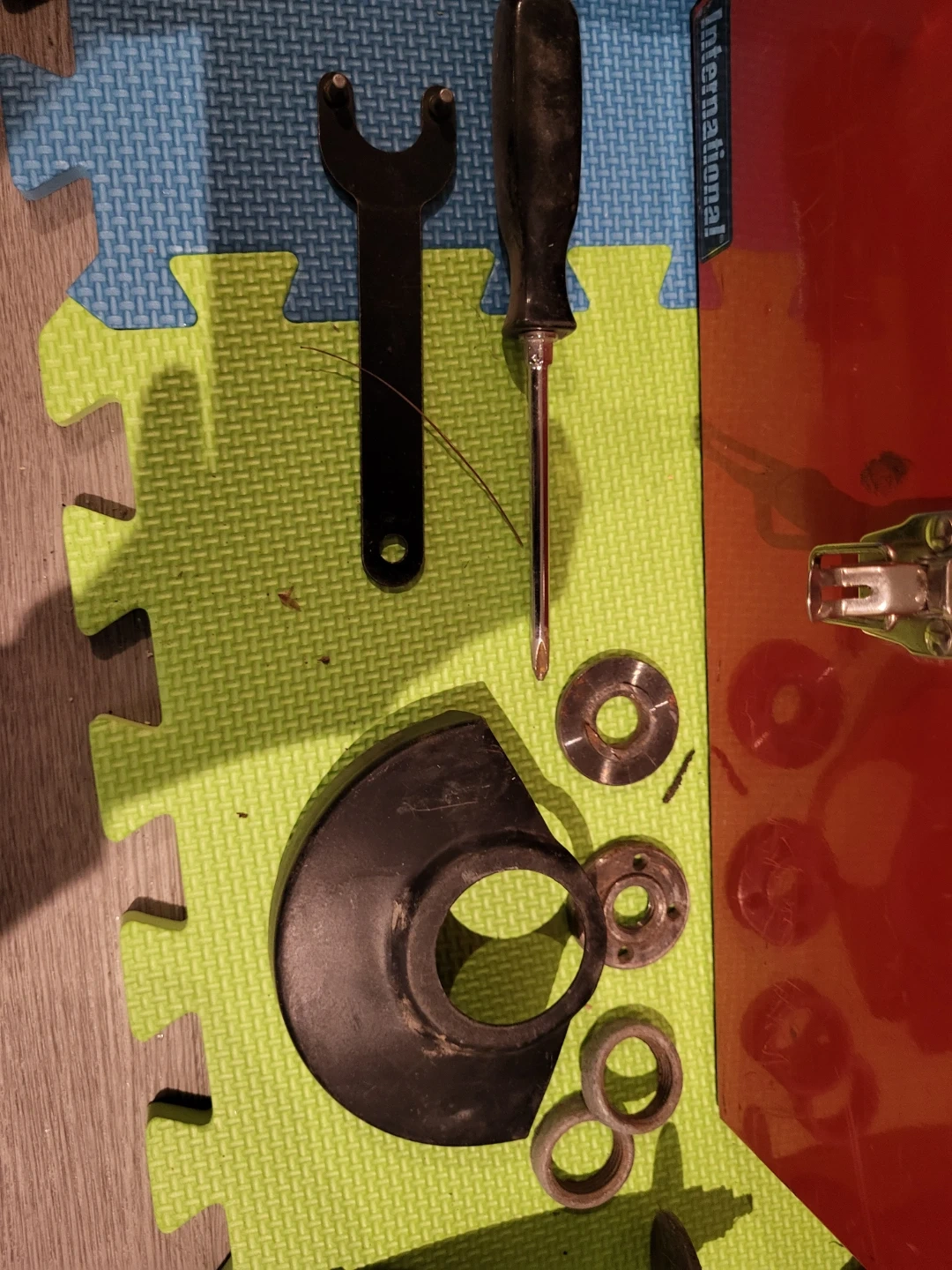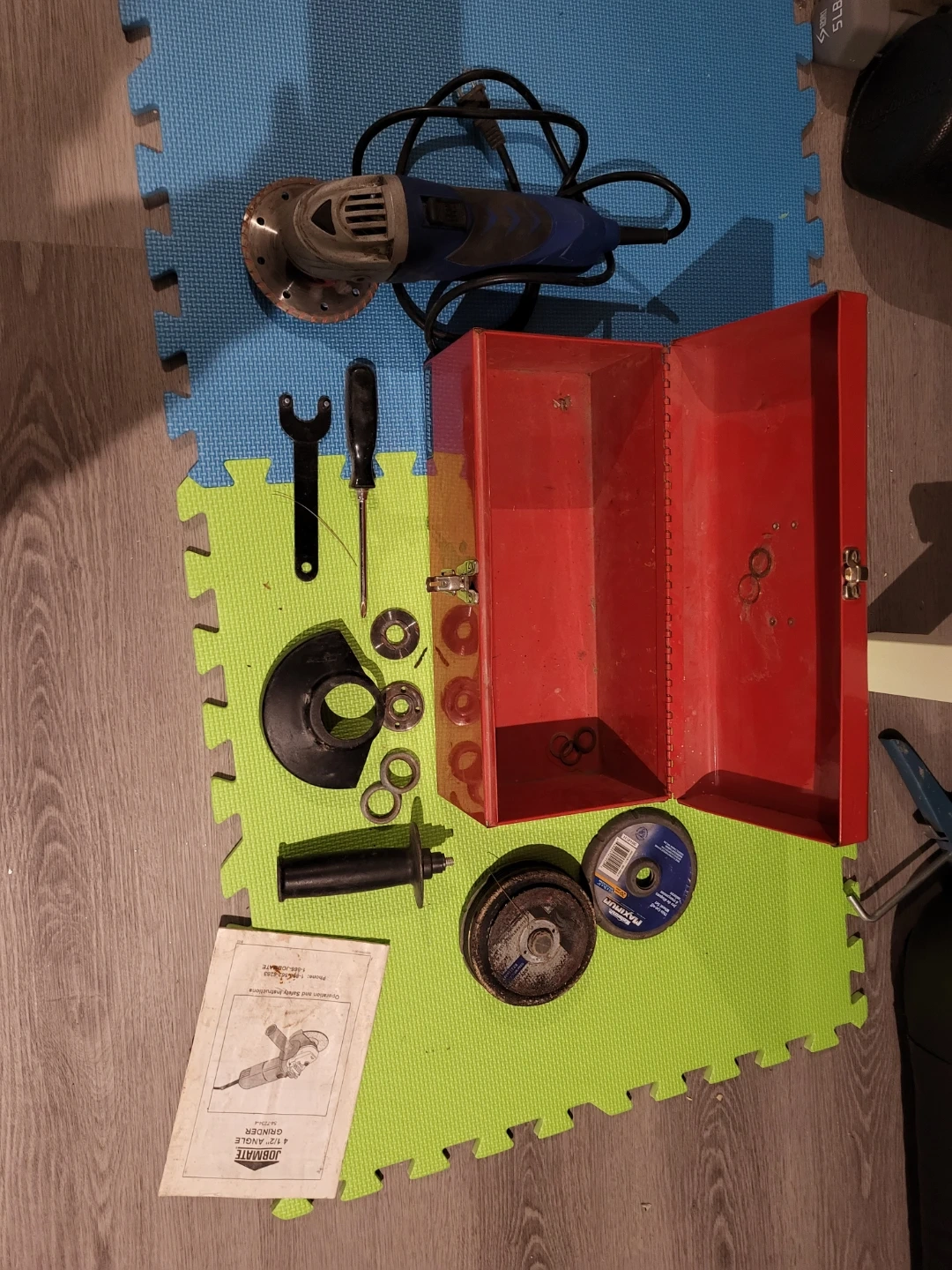 This set includes a Mastercraft angle grinder and a 20-piece thin cut-off wheel set. The grinder comes with a wrench, screwdriver, and guard. Some extra washers and a manual are also included. This is a handy kit for various cutting and grinding tasks.