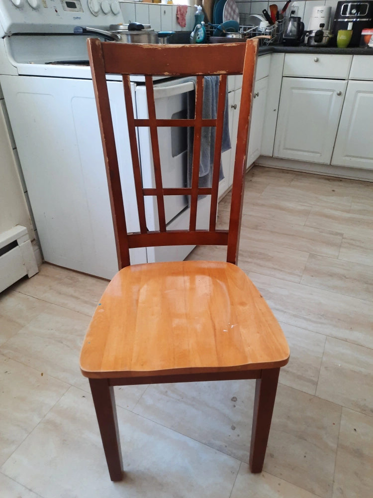 This is a solid wood dining chair with a warm, natural finish. It features a comfortable, slightly contoured seat and a classic slatted backrest. Shows some minor wear consistent with use.