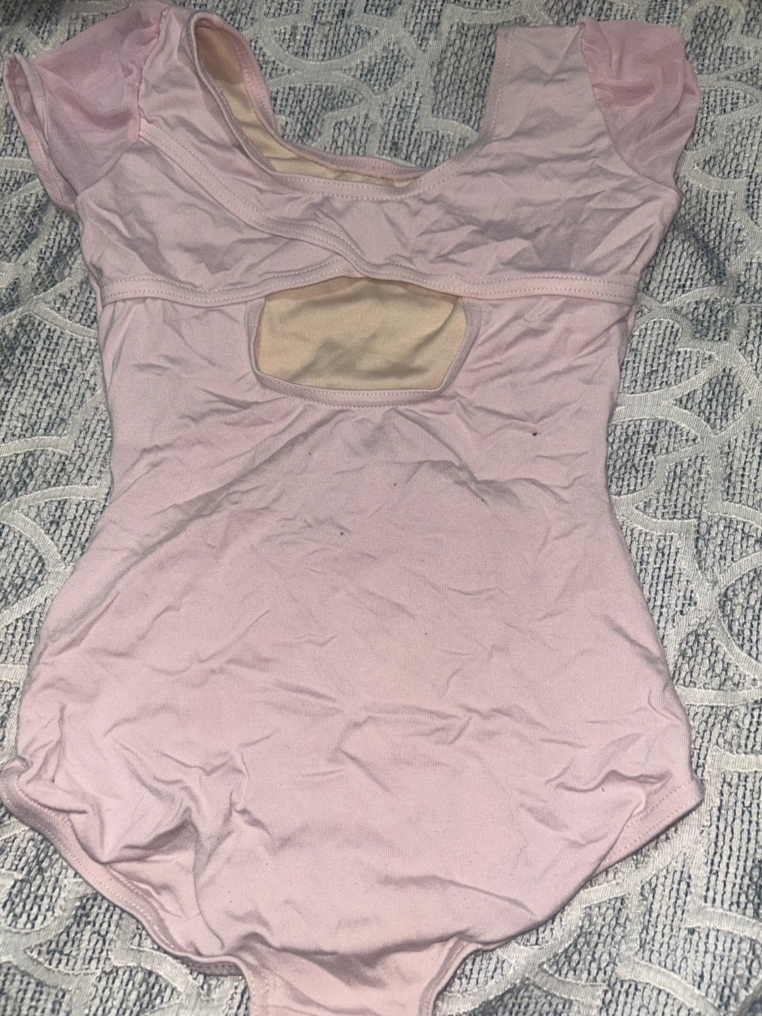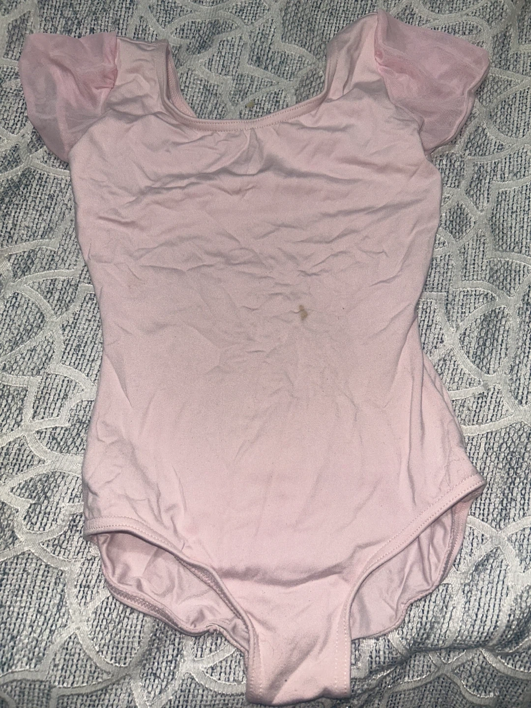 A sweet pink ballet leotard designed for comfort and movement. It features delicate cap sleeves made of sheer fabric.